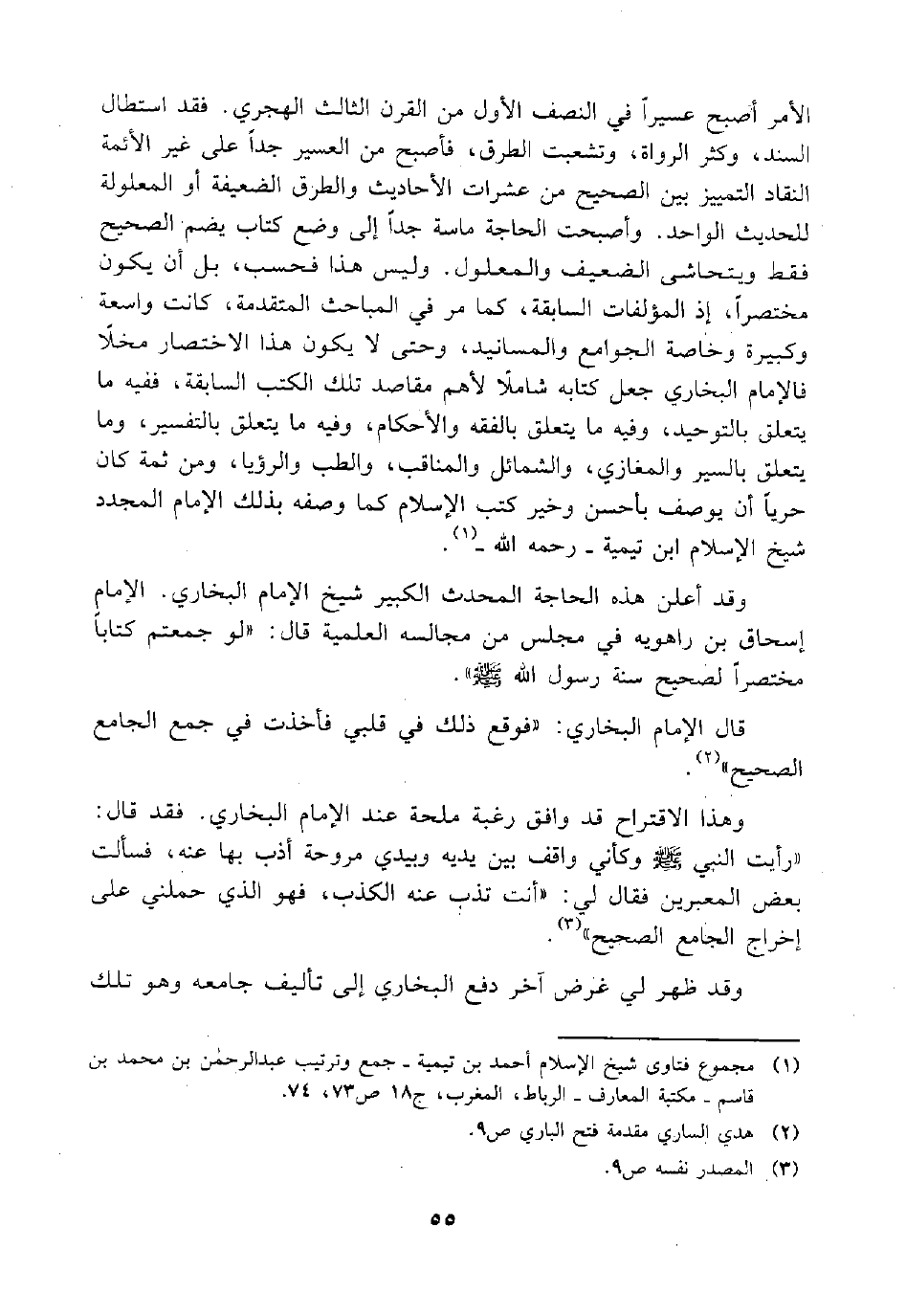الأمر أصبح عسيراً في النصف الأول من القرن الثالث الهجري. فقد استطال السند، وكثر الرواة، وتشعبت الطرق، فأصبح من العسير جداً على غير الأئمة النقاد التمييز بين الصحيح من عشرات الأحاديث والطرق الضعيفة أو المعلولة للحديث الواحد. وأصبحت الحاجة ماسة جداً إلى وضع كتاب يضم الصحيح فقط ويتحاشى الضعيف والمعلول. وليس هذا فحسب، بل أن يكون مختصراً، إذ المؤلفات السابقة، كما مر في المباحث المتقدمة، كانت واسعة وكبيرة وخاصة الجوامع والمسانيد، وحتى لا يكون هذا لاختصار مخلاً فالإمام البخاري جعل كتابه شاملاً لأهم مقاصد تلك الكتب السابقة، ففيه ما يتعلق بالتوحيد، وفيه ما يتعلق بالفقه والأحكام، وفيه ما يتعلق بالتفسير، وما يتعلق بالسير والمغازي، والشمائل والمناقب، والطب والرؤيا، ومن ثمة كان حرياً أن يوصف بأحسن وخير كتب الإسلام كما وصفه بذلك الإمام المجدد شيخ الإسلام ابن تيمية - رحمه الله - (¬1) .