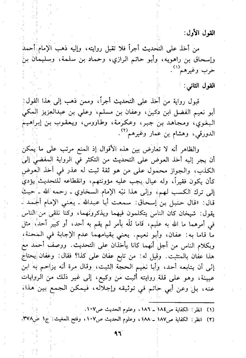 قبول رواية من أخذ على التحديث أجراً، وممن ذهب إلى هذا القول: أبو نعيم الفضل ابن دكين، وعفان بن مسلم، وعلي بن عبد العزيز المكي البغوي، ومجاهد بن جبر، وعكرمة، وطاووس، ويعقوب بن إبراهيم الدورقي، وهشام بن عمار وغيرهم (¬2) .