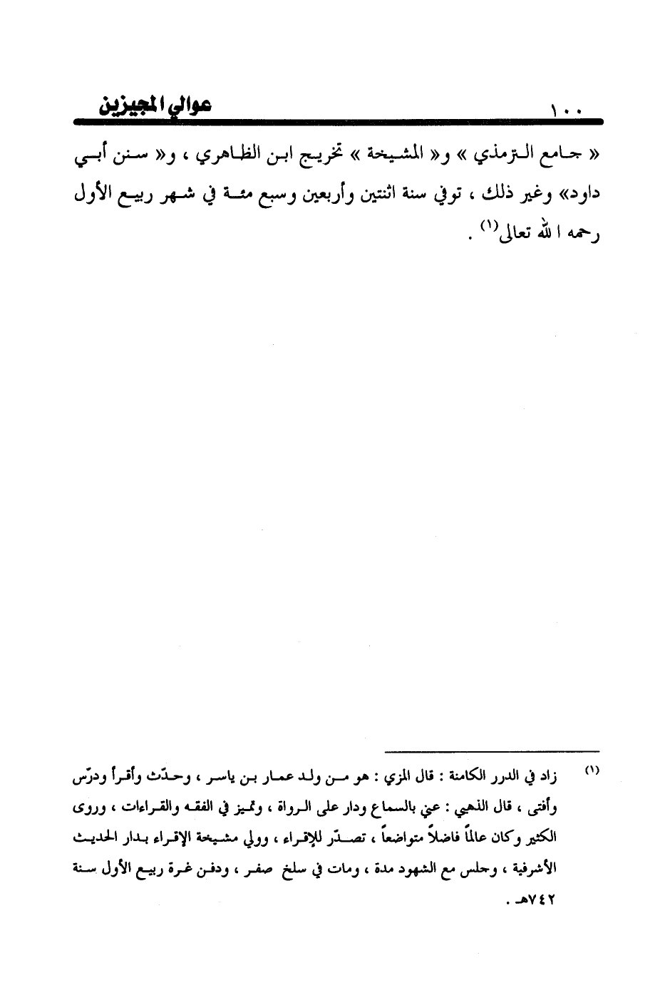 جَامِعَ التِّرْمِذِيِّ، وَالْمَشْيَخَةَ، تَخْرِيجُ ابْنِ الظَّاهِرِيِّ، وَسُنَنَ أَبِي دَاوُدَ، وَغَيْرَ ذَلِكَ، تُوُفِّيَ سَنَةَ اثْنَتَيْنِ وَأَرْبَعِينَ وَسَبْعِ مِائَةٍ فِي شَهْرِ رَبِيعِ الْأَوَّلِ رَحِمَهُ اللَّهُ تَعَالَى