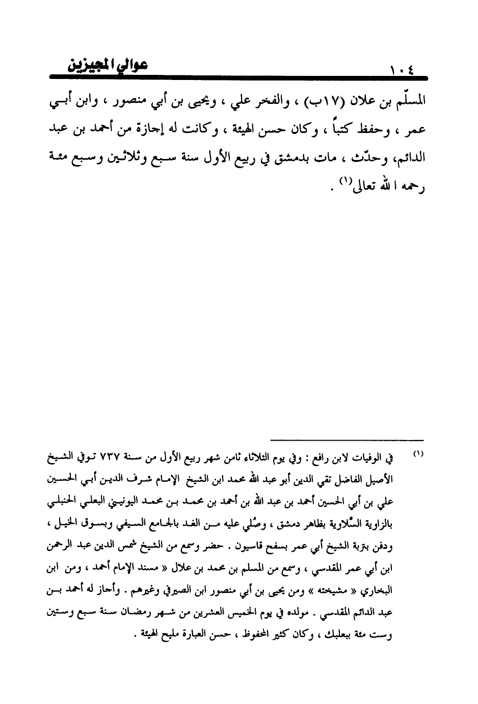 الْمُسْلِمِ بْنِ عَلَّانٍ، وَالْفَخْرِ عَلِيٍّ، وَيَحْيَى بْنِ أَبِي مَنْصُورٍ، وَابْنِ أَبِي عُمَرَ، وَحَفِظَ كُتُبًا، وَكَانَ حَسَنَ الْهَيْئَةِ، وَكَانَتْ لَهُ إِجَازَةٌ مِنْ أَحْمَدَ بْنِ عَبْدِ الدَّائِمِ، وَحَدَّثَ، مَاتَ بِدِمَشْقَ فِي رَبِيعِ الْأَوَّلِ سَنَةَ سَبْعٍ وَثَلَاثِينَ وَسَبْعِ مِائَةٍ رَحِمَهُ اللَّهُ تَعَالَى