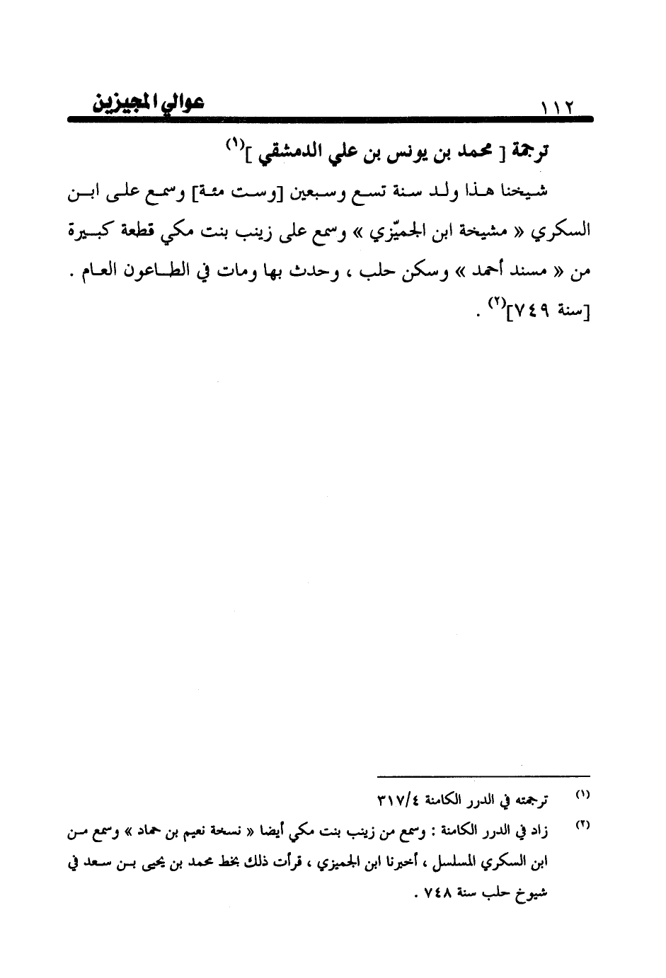 تَرْجَمَةُ مُحَمَّدِ بْنِ يُونُسَ بْنِ عَلِيٍّ الدِّمَشْقِيِّ شَيْخُنَا هَذَا وُلِدَ سَنَةَ تِسْعٍ وَسَبْعِينَ وَسِتِّ مِائَةٍ وَسَمِعَ عَلَى ابْنِ السُّكَّرِيِّ مَشْيَخَةَ ابْنِ الجُمَّيْزِيِّ، وَسَمِعَ عَلَى زَيْنَبَ بِنْتِ مَكِّيٍّ قِطْعَةً كَبِيرَةً مِنْ، مُسْنَدِ أَحْمَدَ، وَسَكَنَ حَلَبَ، وَحَدَّثَ بِهَا وَمَاتَ فِي الطَّاعُونِ الْعَامَ سَنَةَ749
