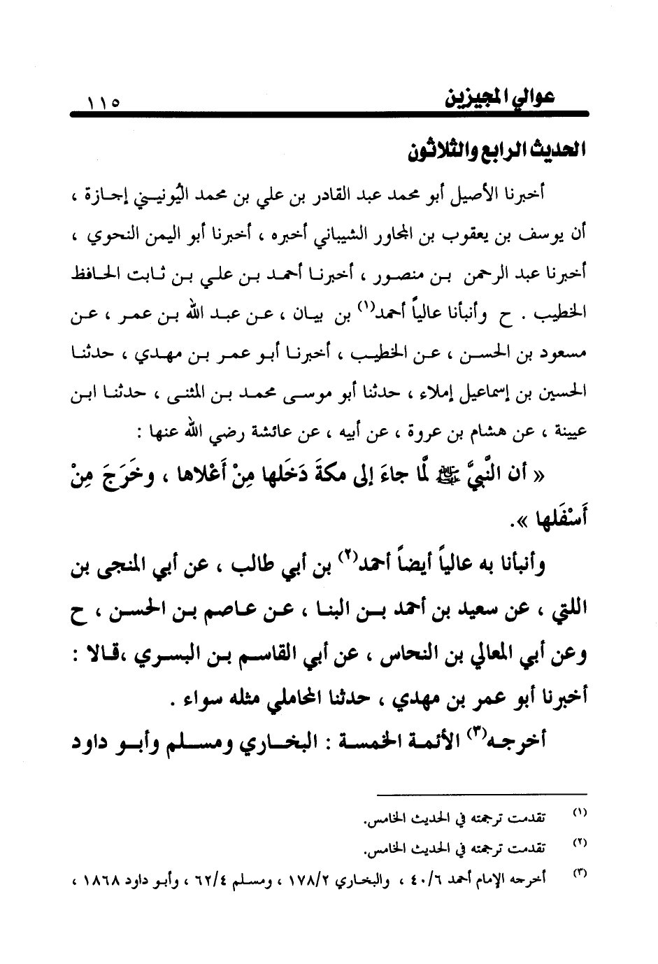 ح وَأَنْبَأَنَا عَالِيًا أَحْمَدُ بْنُ بَيَانٍ، عَنْ عَبْدِ اللَّهِ بْنِ عُمَرَ، عَنْ مَسْعُودِ بْنِ الْحَسَنِ، عَنِ الْخَطِيبِ، أَخْبَرَنَا أَبُو عُمَرَ بْنُ مَهْدِيٍّ، حَدَّثَنَا الْحُسَيْنُ بْنُ إِسْمَاعِيلَ إِمْلَاءً، حَدَّثَنَا أَبُو مُوسَى مُحَمَّدُ بْنُ الْمُثَنَّى، حَدَّثَنَا ابْنُ عُيَيْنَةَ، عَنْ هِشَامِ بْنِ عُرْوَةَ، عَنْ أَبِيهِ، عَنْ عَائِشَةَ رَضِيَ اللَّهُ عَنْهَا، «أَنَّ النَّبِيَّ صَلَّى اللَّهُ عَلَيْهِ وَسَلَّمَ لَمَّا جَاءَ إِلَى مَكَّةَ دَخَلَهَا مِنْ أَعْلَاهَا، وَخَرَجَ مِنْ أَسْفَلِهَا» .