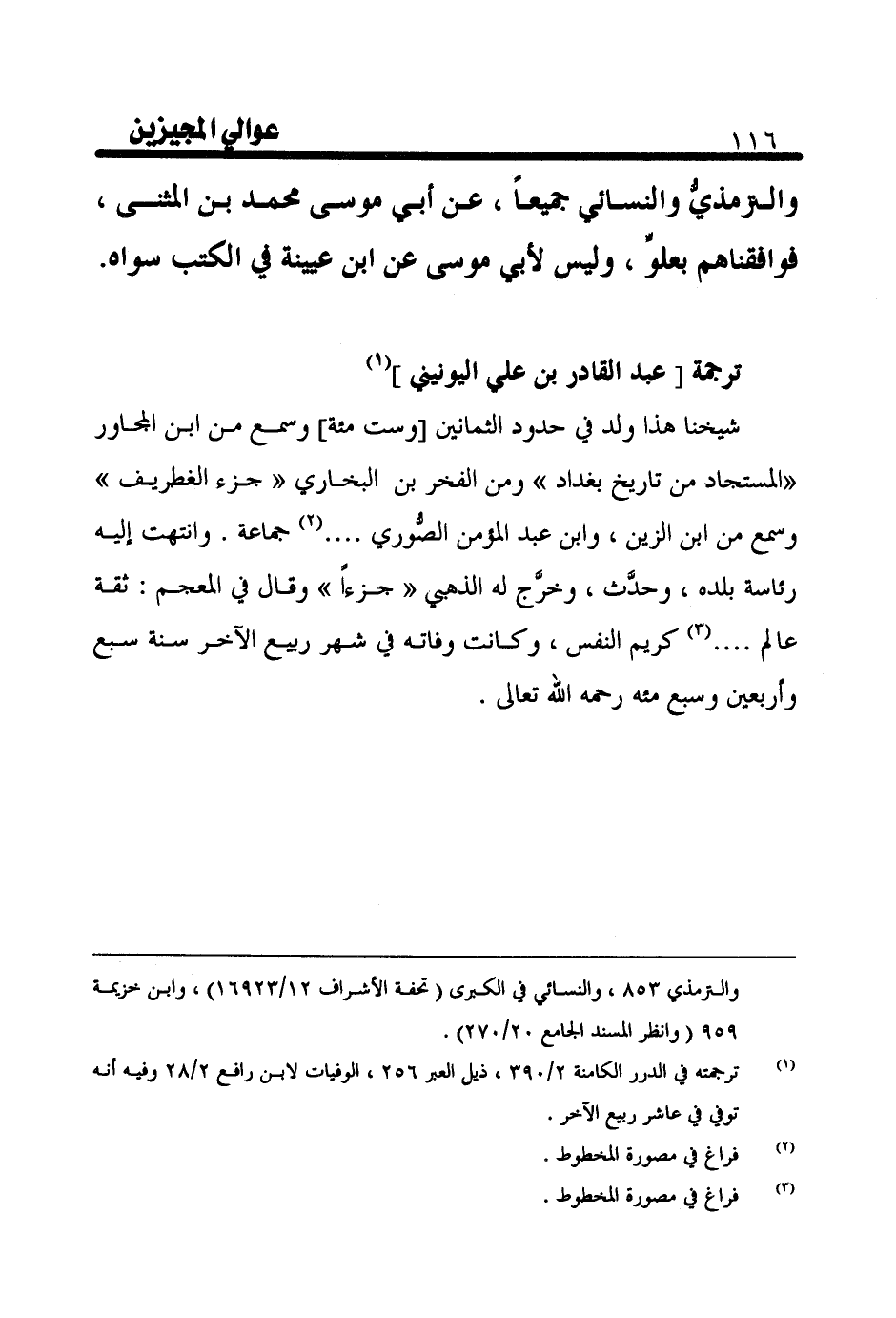 تَرْجَمَةُ عَبْدِ الْقَادِرِ بْنِ عَلِيٍّ الْيُونِينِيِّ شَيْخُنَا هَذَا وُلِدَ فِي حُدُودِ الثَّمَانِينَ وَسِتِّ مِائَةٍ وَسَمِعَ مِنَ ابْنِ الْمُجَاوِرِ «الْمُسْتَجَادَ مِنْ تَارِيخِ بَغْدَادَ» وَمِنَ الْفَخْرِ بْنِ الْبُخَارِيِّ «جُزْءَ الْغِطْرِيفِ» وَسَمِعَ مِنَ ابْنِ الزَّيْنِ، وَابْنِ عَبْدِ الْمُؤْمِنِ الصُّورِيِّ. . . . جماعة، وَانْتَهَتْ إِلَيْهِ رِئَاسَةُ بَلَدِهِ وَحَدَّثَ، وَخَرَّجَ لَهُ الذَّهَبِيُّ جُزْءًا، وَقَالَ فِي الْمُعْجَمِ: ثِقَةٌ عَالِمٌ. . . . كَرِيمُ النَّفْسِ، وَكَانَتْ وَفَاتُهُ فِي شَهْرِ رَبِيعِ الْآخِرِ سَنَةَ سَبْعٍ وَأَرْبَعِينَ وَسَبْعِ مِائَةٍ رَحِمَهُ اللَّهُ تَعَالَى