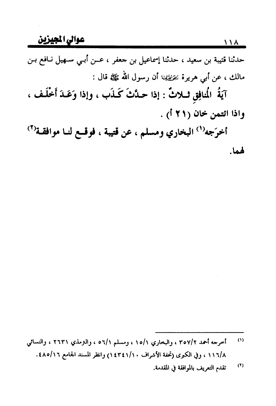 حَدَّثَنَا قُتَيْبَةُ بْنُ سَعِيدٍ، حَدَّثَنَا إِسْمَاعِيلُ بْنُ جَعْفَرٍ، عَنْ أَبِي سُهَيْلٍ نَافِعِ بْنِ مَالِكٍ، عَنْ أَبِي هُرَيْرَةَ رَضِيَ اللَّهُ عَنْهُ، أَنَّ رَسُولَ اللَّهِ صَلَّى اللَّهُ عَلَيْهِ وَسَلَّمَ قَالَ: " آيَةُ الْمُنَافِقِ ثَلَاثٌ: إِذَا حَدَّثَ كَذَبَ، وَإِذَا وَعَدَ أَخْلَفَ، وَإِذَا ائْتُمِنَ خَانَ ".