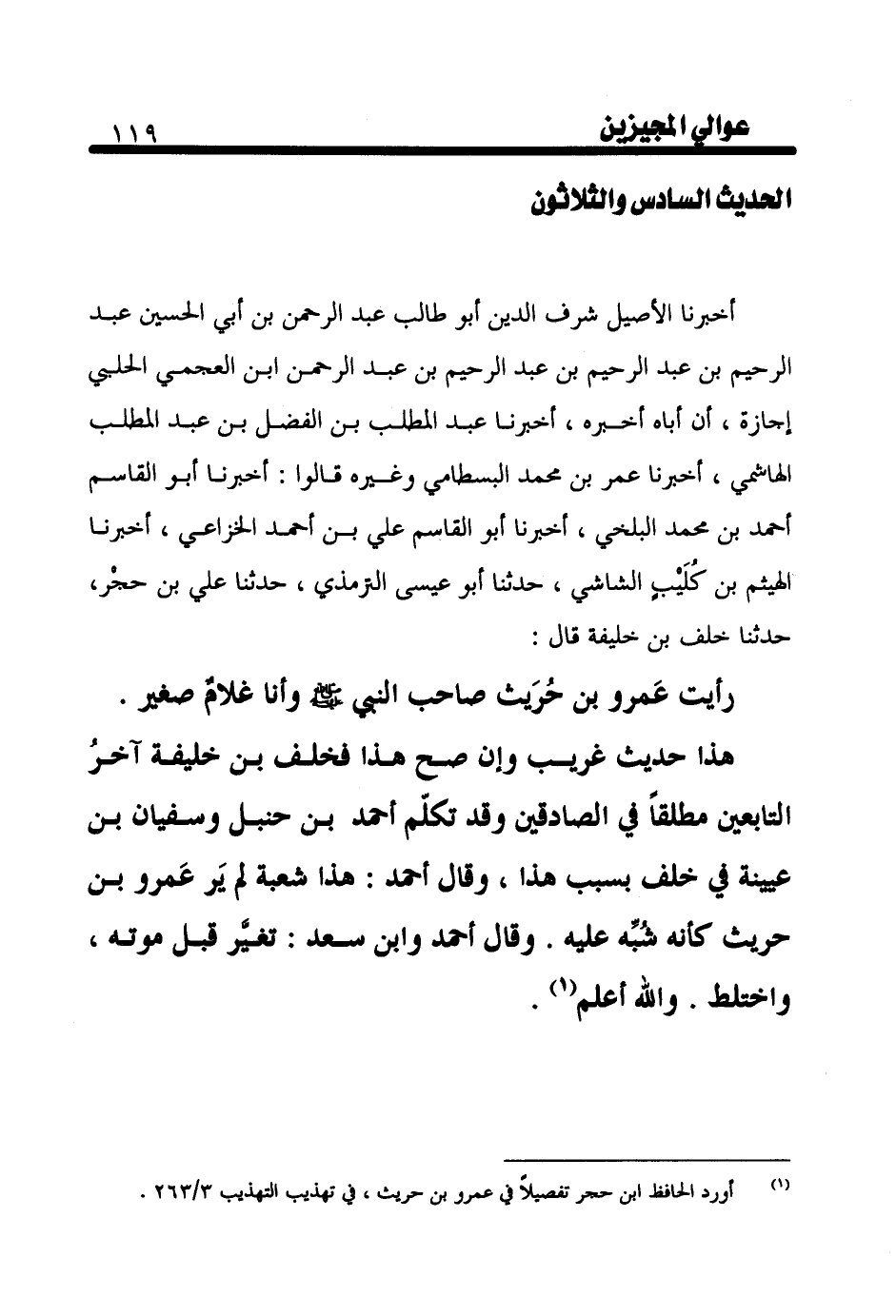 أَخْبَرَنَا الْأَصِيلُ شَرَفُ الدِّينِ أَبُو طَالِبٍ عَبْدُ الرَّحْمَنِ بْنُ أَبِي الْحُسَيْنِ عَبْدِ الرَّحِيمِ بْنِ عَبْدِ الرَّحِيمِ بْنِ عَبْدِ الرَّحِيمِ بْنِ عَبْدِ الرَّحْمَنِ بْنِ الْعَجَمِيِّ الْحَلَبِيُّ إِجَازَةً، أَنَّ أَبَاهُ أَخْبَرَهُ، أَخْبَرَنَا عَبْدُ الْمُطَّلِبِ بْنُ الْفَضْلِ بْنِ عَبْدِ الْمُطَّلِبِ الْهَاشِمِيُّ، أَخْبَرَنَا وَغَيْرِهِ، عُمَرُ بْنُ مُحَمَّدٍ الْبِسْطَامِيُّ قَالُوا: أَخْبَرَنَا أَبُو الْقَاسِمِ أَحْمَدُ بْنُ مُحَمَّدٍ الْبَلْخِيُّ، أَخْبَرَنَا أَبُو الْقَاسِمِ عَلِيُّ بْنُ أَحْمَدَ الْخُزَاعِيُّ، أَخْبَرَنَا الْهَيْثَمُ بْنُ كُلَيْبٍ الشَّاشِيُّ، حَدَّثَنَا أَبُو عِيسَى التِّرْمِذِيُّ، حَدَّثَنَا عَلِيُّ بْنُ حُجْرٍ، حَدَّثَنَا خَلَفُ بْنُ خَلِيفَةَ، قَالَ: «رَأَيْتُ عَمْرَو بْنَ حُرَيْثٍ صَاحِبَ النَّبِيِّ صَلَّى اللَّهُ عَلَيْهِ وَسَلَّمَ وَأَنَا غُلَامٌ صَغِيرٌ» .