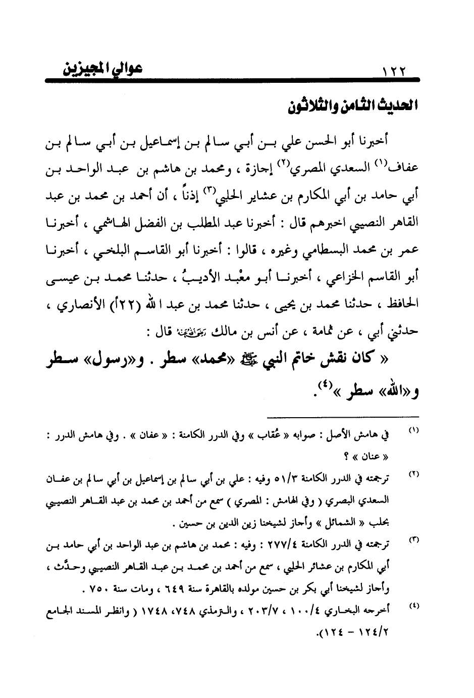 أَخْبَرَنَا أَبُو الْحَسَنِ عَلِيُّ بْنُ أَبِي سَالِمِ بْنِ إِسْمَاعِيلَ بْنِ أَبِي سَالِمِ بْنِ عَفَافٍ السَّعْدِيُّ الْمِصْرِيُّ إِجَازَةً، وَمُحَّمَدُ بْنُ هَاشِمِ بْنِ عَبْدِ الْوَاحِدِ بْنِ أَبِي حَامِدِ بْنِ أَبِي الْمَكَارِمِ بْنِ عَشَايِرَ الْحَلَبِيُّ إِذْنًا، أَنَّ أَحْمَدَ بْنَ مُحَمَّدِ بْنِ عَبْدِ الْقَاهِرِ النَّصِيبِيَّ أَخْبَرَهُمْ، قَالَ: أَخْبَرَنَا عَبْدُ الْمُطَّلِبِ بْنُ الْفَضْلِ الْهَاشِمِيُّ، أَخْبَرَنَا وَغَيْرُهُ، عُمَرُ بْنُ مُحَمَّدٍ الْبِسْطَامِيُّ قَالُوا: أَخْبَرَنَا أَبُو الْقَاسِمِ الْبَلْخِيُّ، أَخْبَرَنَا أَبُو الْقَاسِمِ الْخُزَاعِيُّ، أَخْبَرَنَا أَبُو مَعْبَدٍ الْأَدِيبُ، حَدَّثَنَا مُحَمَّدُ بْنُ عِيسَى الْحَافِظُ، حَدَّثَنَا مُحَمَّدُ بْنُ يَحْيَى، حَدَّثَنَا مُحَمَّدُ بْنُ عَبْدِ اللَّهِ الْأَنْصَارِيُّ، حَدَّثَنِي أَبِي، عَنْ ثُمَامَةَ، عَنْ أَنَسِ بْنِ مَالِكٍ رَضِيَ اللَّهُ عَنْهُ، قَالَ: «كَانَ نَقْشُ خَاتَمِ النَّبِيِّ صَلَّى اللَّهُ عَلَيْهِ وَسَلَّمَ، مُحَمَّدٌ سَطْرٌ، وَرَسُولٌ سَطْرٌ، وَاللَّهُ سَطْرٌ» .