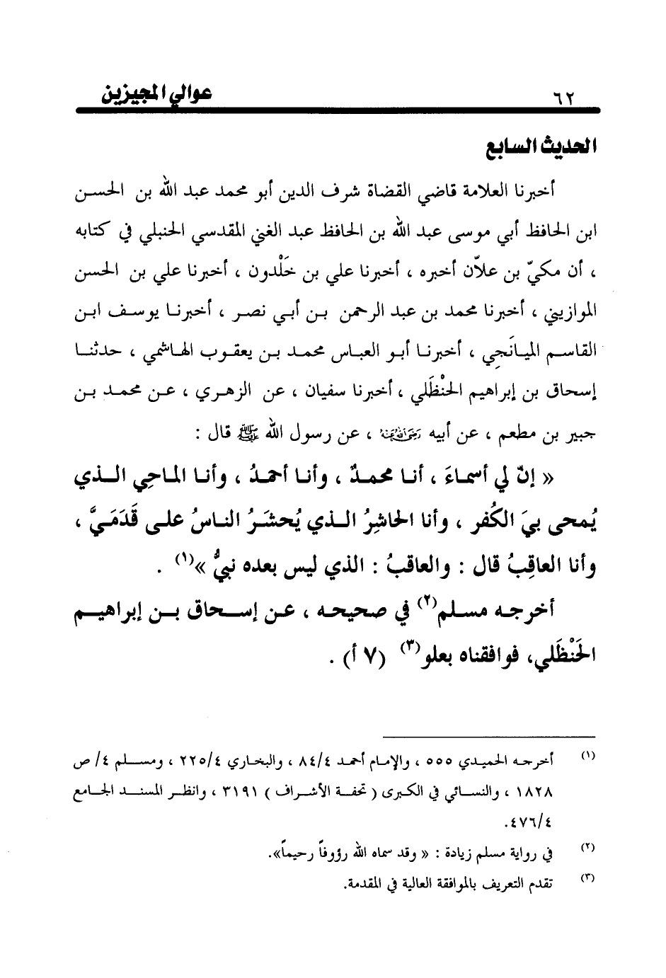 أَخْبَرَنَا الْعَلَّامَةُ قَاضِي الْقُضَاةِ شَرَفُ الدِّينِ أَبُو مُحَمَّدٍ عَبْدُ اللَّهِ بْنُ الْحَسَنِ بْنِ الْحَافِظِ أَبِي مُوسَى عَبْدِ اللَّهِ بْنِ الْحَافِظِ عَبْدِ الْغَنِيِّ الْمَقْدِسِيُّ الْحَنْبَلِيُّ فِي كِتَابِهِ، أَنَّ مَكِيَّ بْنَ عَلَّانٍ أَخْبَرَهُ، أَخْبَرَنَا عَلِيُّ بْنُ خَلْدُونَ، أَخْبَرَنَا عَلِيُّ بْنُ الْحَسَنِ الْمَوَازِينِيُّ، أَخْبَرَنَا مُحَمَّدُ بْنُ عَبْدِ الرَّحْمَنِ بْنِ أَبِي نَصْرٍ، أَخْبَرَنَا يُوسُفُ بْنُ الْقَاسِمِ الْمَيَانَجِيُّ، أَخْبَرَنَا أَبُو الْعَبَّاسِ مُحَمَّدُ بْنُ يَعْقُوبَ الْهَاشِمِيُّ، حَدَّثَنَا إِسْحَاقُ بْنُ إِبْرَاهِيمَ الْحَنْظَلِيُّ، أَخْبَرَنَا سُفْيَانُ، عَنِ الزُّهْرِيِّ، عَنْ مُحَمَّدِ بْنِ جُبَيْرِ بْنِ مُطْعِمٍ، عَنْ أَبِيهِ رَضِيَ اللَّهُ عَنْهُ، عَنْ رَسُولِ اللَّهِ صَلَّى اللَّهُ عَلَيْهِ وَسَلَّمَ قَالَ: " إِنَّ لِي أَسْمَاءً، أَنَا مُحَمَّدٌ، وَأَنَا أَحْمَدُ، وَأَنَا الْمَاحِي الَّذِي يُمْحَى بِيَ الْكُفْرُ، وَأَنَا الْحَاشِرُ الَّذِي يُحْشَرُ النَّاسُ عَلَى قَدَمَيَّ، وَأَنَا الْعَاقِبُ، قَالَ: وَالْعَاقِبُ الَّذِي لَيْسَ بَعْدَهُ نَبِيٌّ "