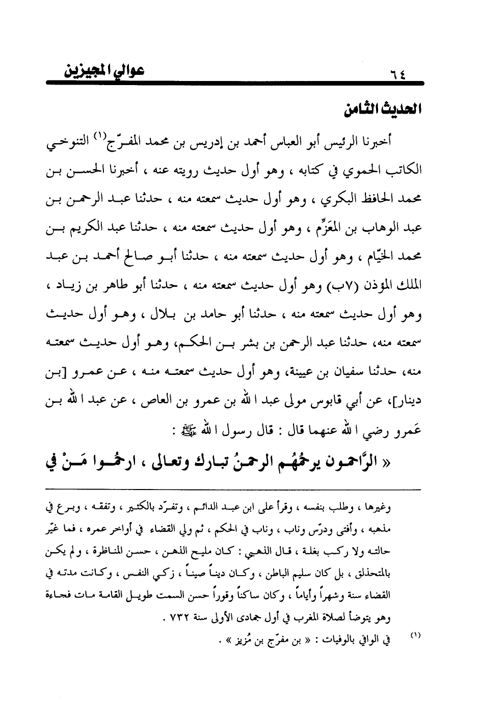أَخْبَرَنَا الرَّئِيسُ أَبُو الْعَبَّاسِ أَحْمَدُ بْنُ إِدْرِيسَ بْنِ مُحَمَّدٍ الْمُفَرِّجُ التَّنُوخِيُّ، الْكَاتِبُ الْحَمَوِيُّ فِي كِتَابِهِ وَهُوَ أَوَّلُ حَدِيثٍ رَوَيْتُهُ عَنْهُ، أَخْبَرَنَا الْحَسَنُ بْنُ مُحَمَّدٍ الْحَافِظُ الْبَكْرِيُّ، وَهُوَ أَوَّلُ حَدِيثٍ سَمِعْتُهُ مِنْهُ، حَدَّثَنَا عَبْدُ الرَّحْمَنِ بْنُ عَبْدِ الْوَهَّابِ بْنِ الْمُعَزِّمِ، وَهُوَ أَوَّلُ حَدِيثٍ سَمِعْتُهُ مِنْهُ، حَدَّثَنَا عَبْدُ الْكَرِيمِ بْنُ مُحَمَّدٍ الْخَيَّامُ، وَهُوَ أَوَّلُ حَدِيثٍ سَمِعْتُهُ مِنْهُ، حَدَّثَنَا أَبُو صَالِحٍ أَحْمَدُ بْنُ عَبْدِ الْمَلِكِ الْمُؤَذِّنُ، وَهُوَ أَوَّلُ حَدِيثٍ سَمِعْتُهُ مِنْهُ، حَدَّثَنَا أَبُو طَاهِرِ بْنُ زِيَادٍ، وَهُوَ أَوَّلُ حَدِيثٍ سَمِعْتُهُ مِنْهُ، حَدَّثَنَا أَبُو حَامِدٍ بِلَالٌ، وَهُوَ أَوَّلُ حَدِيثٍ سَمِعْتُهُ مِنْهُ، حَدَّثَنَا عَبْدُ الرَّحْمَنِ بْنُ بِشْرِ بْنِ الْحَكَمِ، وَهُوَ أَوَّلُ حَدِيثٍ سَمِعْتُهُ مِنْهُ، حَدَّثَنَا سُفْيَانُ بْنُ عُيَيْنَةَ، وَهُوَ أَوَّلُ حَدِيثٍ سَمِعْتُهُ مِنْهُ، عَنْ عَمْرِو بْنِ دِينَارٍ، عَنْ أَبِي قَابُوسَ مَوْلَى عَبْدِ اللَّهِ بْنِ عَمْرِو بْنِ الْعَاصِ، عَنْ عَبْدِ اللَّهِ بْنِ عَمْرٍو رَضِيَ اللَّهُ عَنْهُمَا، قَالَ: قَالَ رَسُولُ اللَّهِ صَلَّى اللَّهُ عَلَيْهِ وَسَلَّمَ: «الرَّاحِمُونَ يَرْحَمُهُمُ الرَّحْمَنُ تَبَارَكَ وَتَعَالَى، ارْحَمُوا مَنْ فِي