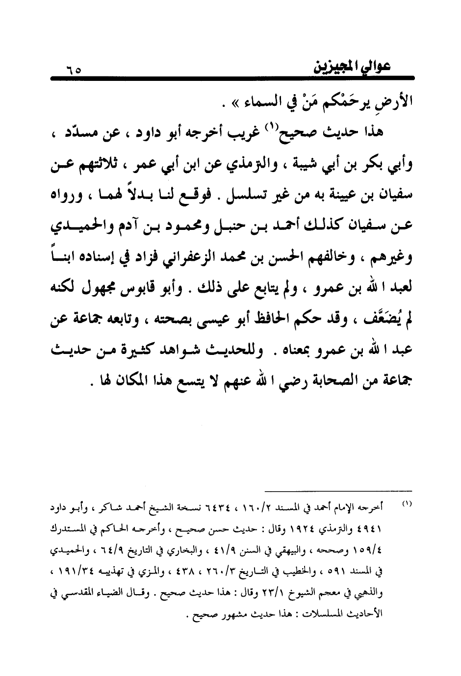 الْأَرْضِ يَرْحَمْكُمْ مَنْ فِي السَّمَاءِ» هَذَا حَدِيثٌ صَحِيحٌ غَرِيبٌ أَخْرَجَهُ أَبُو دَاوُدَ، عَنْ مُسَدَّدٍ، وَأَبِي بَكْرِ بْنِ شَيْبَةَ، وَالتِّرْمِذِيُّ عَنِ ابْنِ أَبِي عُمَرَ، ثَلَاثتَهُمْ عَنْ سُفْيَانَ بْنِ عُيَيْنَةَ بِهِ مِنْ غَيْرِ تَسَلْسُلٍ، فَوَقَعَ لَنَا بَدَلًا لَهُمَا، وَرَوَاهُ عَنْ , سُفْيَانَ كَذَلِكَ أَحْمَدُ بْنُ حَنْبَلٍ، مَحْمُودُ بْنُ آدَمَ وَالْحُمَيْدِيُّ وَغَيْرِهِمْ، وَخَالَفَهُمُ الْحَسَنُ بْنُ مُحَمَّدٍ الزَّعْفَرَانِيُّ، فَزَادَ فِي إِسْنَادِهِ ابْنًا لِعَبْدِ اللَّهِ بْنِ عَمْرٍو، وَلَمْ يُتَابِعْ عَلَى ذَلِكَ، وَأَبُو قَابُوسَ مَجْهُولٌ لَكِنَّهُ لَمْ يُضَعَّفْ، وَقَدْ حَكَمَ الْحَافِظُ أَبُو عِيسَى بِصِحَّتِهِ، وَتَابَعَهُ جَمَاعَةٌ عَنْ عَبْدِ اللَّهِ بْنِ عَمْرٍو بِمَعْنَاهُ، وَلِلْحَدِيثِ شَوَاهِدُ كَثِيرَةٌ مِنْ حَدِيثِ جَمَاعَةٍ مِنَ الصَّحَابَةِ رَضِيَ اللَّهُ عَنْهُمْ لَا يَتَّسِعُ هَذَا الْمَكَانُ لَهَا.