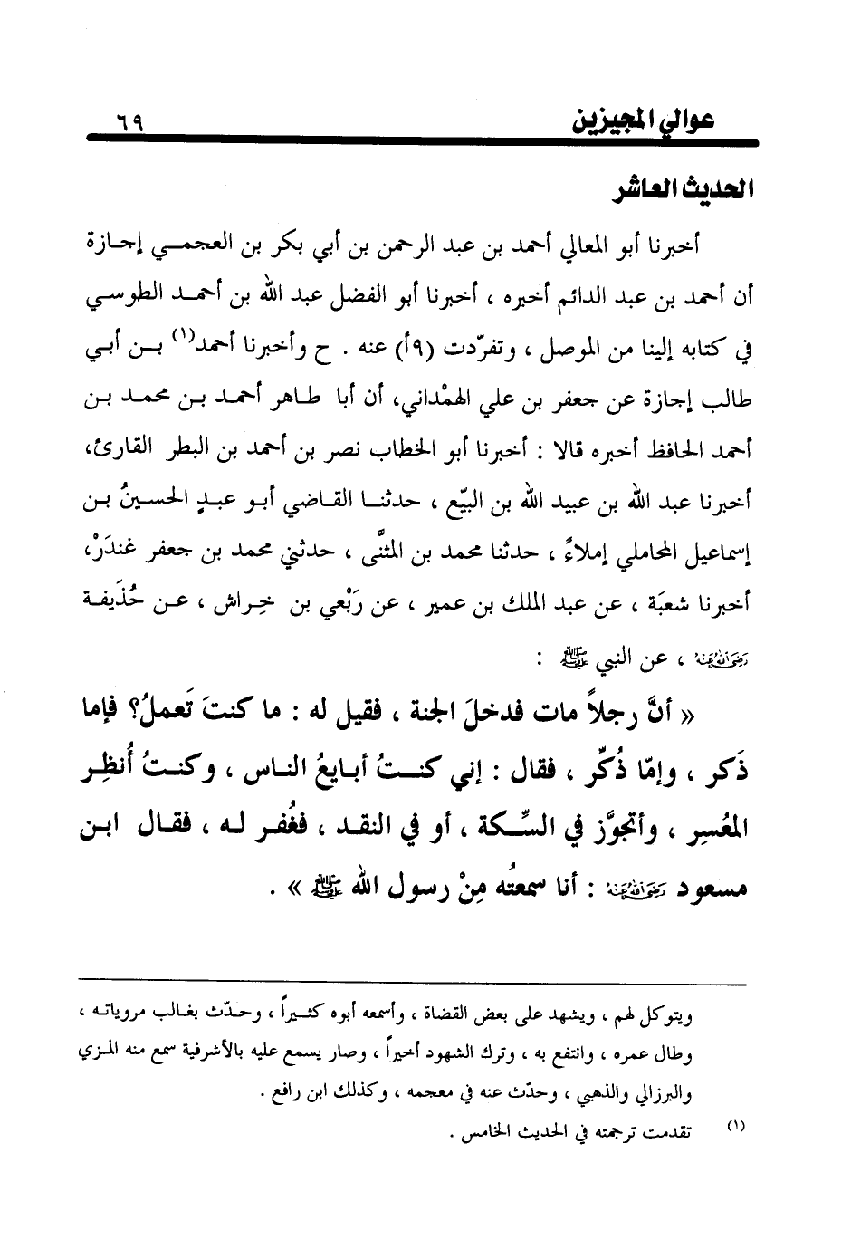 ح وَأَخْبَرَنَا أَحْمَدُ بْنُ أَبِي طَالِبٍ إِجَازَةً، عَنْ جَعْفَرِ بْنِ عَلِيٍّ الْهَمْدَانِيِّ، أَنَّ أَبَا طَاهِرٍ أَحْمَدَ بْنَ مُحَمَّدِ بْنِ أَحْمَدَ الْحَافِظَ أَخْبَرَهُ، قَالَا: أَخْبَرَنَا أَبُو الْخَطَّابِ نَصْرُ بْنُ أَحْمَدَ بْنِ الْبَطِرِ الْقَارِئُ، أَخْبَرَنَا عَبْدُ اللَّهِ بْنُ عُبَيْدِ اللَّهِ بْنِ الْبَيِّعِ، حَدَّثَنَا الْقَاضِي أَبُو عَبْدِ اللَّهِ الْحُسَيْنُ بْنُ إِسْمَاعِيلَ الْمَحَامِلِيُّ إِمْلَاءً، حَدَّثَنَا مُحَمَّدُ بْنُ الْمُثَنَّى، حَدَّثَنِي مُحَمَّدُ بْنُ جَعْفَرٍ غُنْدَرٌ، أَخْبَرَنَا شُعْبَةُ، عَنْ عَبْدِ الْمَلِكِ بْنِ عُمَيْرٍ، عَنْ رَبْعِيِّ بْنِ حِرَاشٍ، عَنْ حُذَيْفَةَ رَضِيَ اللَّهُ عَنْهُ، عَنِ النَّبِيِّ صَلَّى اللَّهُ عَلَيْهِ وَسَلَّمَ: " أَنَّ رَجُلًا مَاتَ فَدَخَلَ الْجَنَّةَ، فَقِيلَ لَهُ: مَا كُنْتَ تَعْمَلُ؟ فَإِمَّا ذَكَرَ، وَإِمَّا ذُكِّرَ، فَقَالَ: إِنِّي كُنْتُ أُبَايِعُ النَّاسِ، وَكُنْتُ أُنْظِرُ الْمُعْسِرَ، وَأَتَجَوَّزُ فِي السِّكَّةِ، أَوْ فِي النَّقْدِ، فَغُفِرَ لَهُ "، فَقَالَ أَبُو مَسْعُودٍ رَضِيَ اللَّهُ عَنْهُ: أَنَا سَمِعْتُهُ مِنْ رَسُولِ اللَّهِ صَلَّى اللَّهُ عَلَيْهِ وَسَلَّمَ.