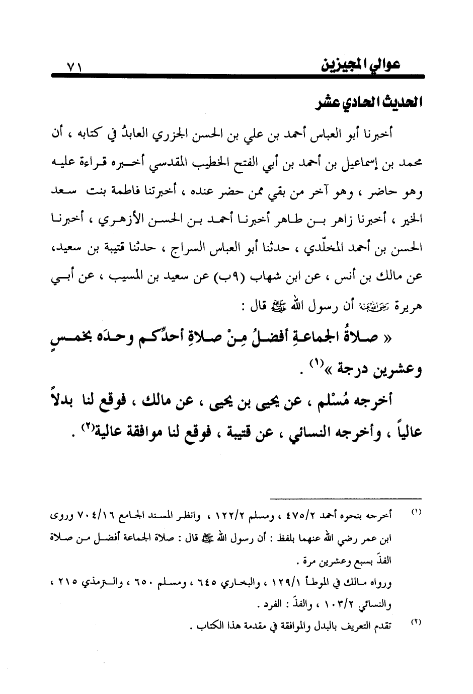 أَخْبَرَنَا أَبُو الْعَبَّاسِ أَحْمَدُ بْنُ عَلِيِّ بْنِ الْحَسَنِ الْجَزَرِيُّ الْعَابِدُ فِي كِتَابِهِ، أَنَّ مُحَمَّدَ بْنَ إِسْمَاعِيلَ بْنِ أَحْمَدَ بْنِ أَبِي الْفَتْحِ الْخَطِيبَ الْمَقْدِسِيَّ أَخْبَرَهُ قِرَاءَةً عَلَيْهِ وَهُوَ حَاضِرٌ، وَهُوَ آخِرُ مَنْ بَقِيَ مِمَّنْ حَضَرَ عِنْدَهُ، أَخْبَرَتْنَا فَاطِمَةُ بِنْتُ سَعْدٍ الْخَيْرِ، أَخْبَرَنَا زَاهِرُ بْنُ طَاهِرٍ، أَخْبَرَنَا أَحْمَدُ بْنُ الْحَسَنِ الْأَزْهَرِيُّ، أَخْبَرَنَا الْحَسَنُ بْنُ أَحْمَدَ الْمُخَلَّدِيُّ، حَدَّثَنَا أَبُو الْعَبَّاسِ السَّرَّاجُ، حَدَّثَنَا قُتَيْبَةُ بْنُ سَعِيدٍ، عَنْ مَالِكِ بْنِ أَنَسٍ، عَنِ ابْنِ شِهَابٍ، عَنْ سَعِيدِ بْنِ الْمُسَيِّبِ، عَنْ أَبِي هُرَيْرَةَ رَضِيَ اللَّهُ عَنْهُ، أَنَّ رَسُولَ اللَّهِ صَلَّى اللَّهُ عَلَيْهِ وَسَلَّمَ قَالَ: «صَلَاةُ الْجَمَاعَةِ أَفْضَلُ مِنْ صَلَاةِ أَحَدِكُمْ وَحْدَهُ بِخَمْسٍ وَعِشْرِينَ دَرَجَةً» .