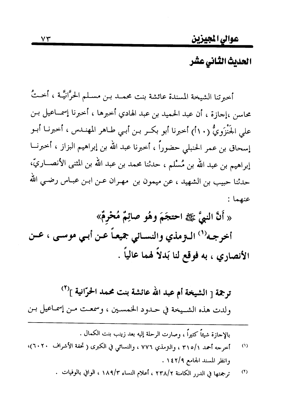 أَخْبَرَتْنَا الشَّيْخَةُ الْمُسْنِدَةُ عَائِشَةُ بِنْتُ مُحَمَّدِ بْنِ مُسْلِمٍ الْحَرَّانِيَّةُ، أُخْتُ مَحَاسِنَ، إِجَازَةً، أَنَّ عَبْدَ الْحَمِيدِ بْنَ عَبْدِ الْهَادِي أَخْبَرَهَا، أَخْبَرَنَا إِسْمَاعِيلُ بْنُ عَلِيٍّ الْجَنْزَوِيُّ، أَخْبَرَنَا أَبُو بَكْرِ بْنُ أَبِي طَاهِرٍ الْمُهَنْدِسُ، أَخْبَرَنَا أَبُو إِسْحَاقَ بْنُ عُمَرَ الْحَنْبَلِيُّ حُضُورًا، أَخْبَرَنَا عَبْدُ اللَّهِ بْنُ إِبْرَاهِيمَ الْبَزَّازِ، أَخْبَرَنَا إِبْرَاهِيمُ بْنُ عَبْدِ اللَّهِ بْنِ مُسْلِمٍ، حَدَّثَنَا مُحَمَّدُ بْنُ عَبْدِ اللَّهِ بْنِ الْمُثَنَّى الْأَنْصَارِيُّ، حَدَّثَنَا حَبِيبُ بْنُ الشَّهِيدِ، عَنْ مَيْمُونِ بْنِ مِهْرَانَ، عَنِ ابْنِ عَبَّاسِ رَضِيَ اللَّهُ عَنْهُمَا، أَنَّ النَّبِيَّ صَلَّى اللَّهُ عَلَيْهِ وَسَلَّمَ احْتَجَمَ وَهُوَ صَائِمٌ مُحْرِمٌ ".