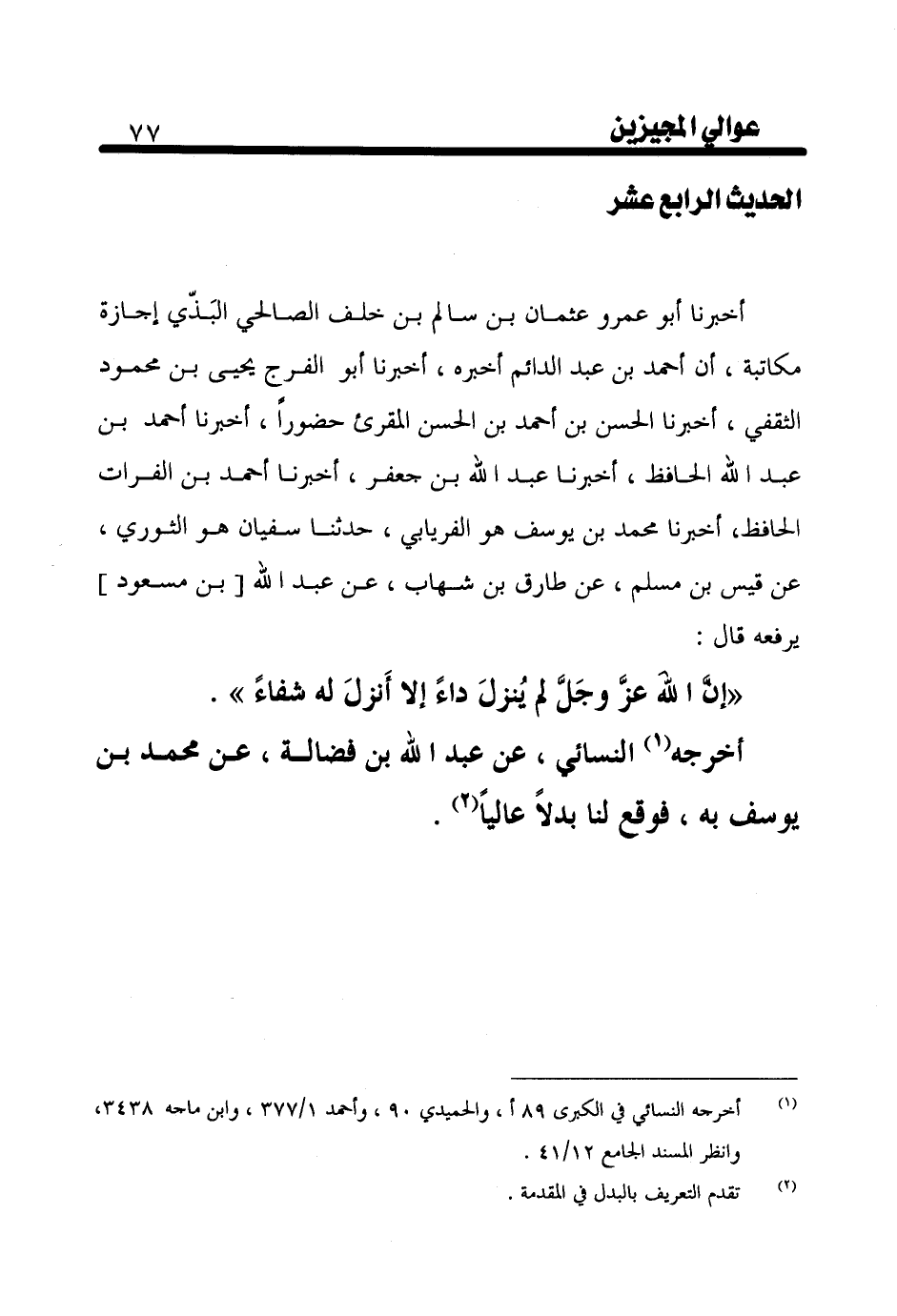 أَخْبَرَنَا أَبُو عَمْرٍو عُثْمَانُ بْنُ سَالِمِ بْنِ خَلَفٍ الصَّالِحِيُّ الْبَذِّيُّ إِجَازَةَ مُكَاتَبَةً، أَنَّ أَحْمَدَ بْنَ عَبْدِ الدَّائِمِ أَخْبَرَهُ، أَخْبَرَنَا أَبُو الْفَرَجِ يَحْيَى بْنُ مَحْمُودٍ الثَّقَفِيُّ، أَخْبَرَنَا الْحَسَنُ بْنُ أَحْمَدَ بْنِ الْحَسَنِ الْمُقْرِئُ حُضُورًا، أَخْبَرَنَا أَحْمَدُ بْنُ عَبْدِ اللَّهِ الْحَافِظُ، أَخْبَرَنَا عَبْدُ اللَّهِ بْنُ جَعْفَرٍ، أَخْبَرَنَا أَحْمَدُ بْنُ الْفُرَاتِ الْحَافِظُ، أَخْبَرَنَا مُحَمَّدُ بْنُ يُوسُفَ هُوَ الْفِرْيَابِيُّ، حَدَّثَنَا سُفْيَانُ هُوَ الثَّوْرِيُّ، عَنْ قَيْسِ بْنِ مُسْلِمٍ، عَنْ طَارِقِ بْنِ شِهَابٍ، عَنْ عَبْدِ اللَّهِ بْنِ مَسْعُودٍ يَرْفَعُهُ، قَالَ: «إِنَّ اللَّهَ عَزَّ وَجَلَّ لَمْ يُنَزِّلَ دَاءً إِلَّا أَنْزَلَ لَهُ شِفَاءً» أَخْرَجَهُ النَّسَائِيُّ، عَنْ عَبْدِ اللَّهِ بْنِ فَضَالَةَ، عَنْ مُحَمَّدِ بْنِ يُوسُفَ بِهِ، فَوَقَعَ لَنَا بَدَلًا عَالِيًا.