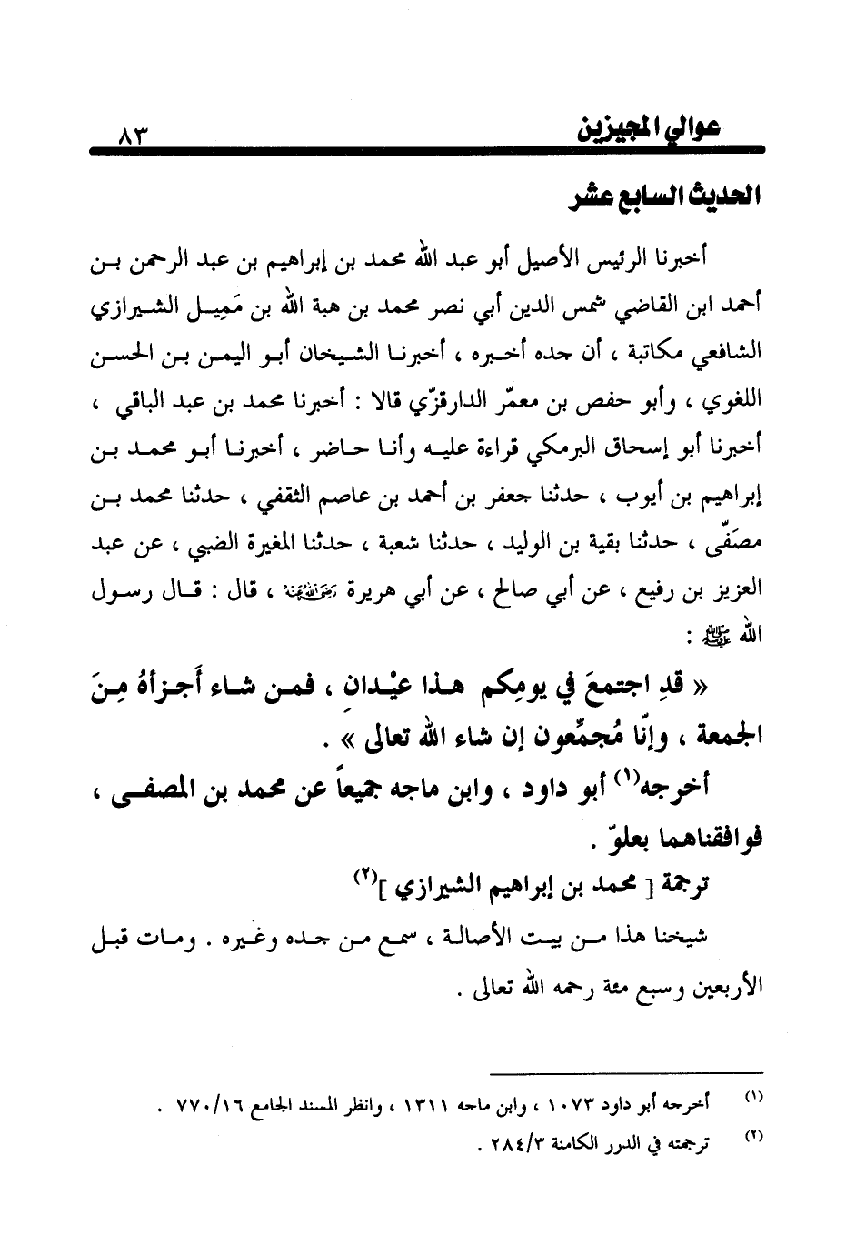 أَخْبَرَنَا الرَّئِيسُ الْأَصِيلُ أَبُو عَبْدِ اللَّهِ مُحَمَّدُ بْنُ إِبْرَاهِيمَ بْنِ عَبْدِ الرَّحْمَنِ بْنِ أَحْمَدَ بْنِ الْقَاضِي شَمْسِ الدِّينِ أَبِي نَصْرٍ مُحَمَّدِ بْنِ هِبَةِ اللَّهِ بْنِ مَمِيلٍ الشِّيرَازِيُّ الشَّافِعِيُّ مُكَاتَبَةً، أَنَّ جَدَّهُ أَخْبَرَهُ، أَخْبَرَنَا الشَّيْخَانِ أَبُو الْيَمَنِ بْنُ الْحَسَنِ اللُّغَوِيُّ، وَأَبُو حَفْصِ بْنُ مَعْمَرٍ الدَّارَقَزِّيُّ، قَالَا: أَخْبَرَنَا مُحَمَّدُ بْنُ عَبْدِ الْبَاقِي، أَخْبَرَنَا أَبُو إِسْحَاقَ الْبَرْمَكِيُّ قِرَاءَةً عَلَيْهِ وَأَنَا حَاضِرٌ، أَخْبَرَنَا أَبُو مُحَمَّدِ بْنُ إِبْرَاهِيمَ بْنِ أَيُّوبَ، حَدَّثَنَا جَعْفَرُ بْنُ أَحْمَدَ بْنِ عَاصِمٍ الثَّقَفِيُّ، حَدَّثَنَا مُحَمَّدُ بْنُ مُصَفًّى، حَدَّثَنَا بَقِيَّةُ بْنُ الْوَلِيدِ، حَدَّثَنَا شُعْبَةُ، حَدَّثَنَا الْمُغِيرَةُ الضَّبِّيُّ، عَنْ عَبْدِ الْعَزِيزِ بْنِ رَفِيعٍ، عَنْ أَبِي صَالِحٍ، عَنْ أَبِي هُرَيْرَةَ رَضِيَ اللَّهُ عَنْهُ، قَالَ: قَالَ رَسُولُ اللَّهِ صَلَّى اللَّهُ عَلَيْهِ وَسَلَّمَ: «قَدِ اجْتَمَعَ فِي يَوْمِكُمْ هَذَا عِيدَانِ، فَمَنْ شَاءَ أَجْزَأَهُ مِنَ الْجُمُعَةِ، وَإِنَّا مُجَمِّعُونَ إِنْ شَاءَ اللَّهُ تَعَالَى» .