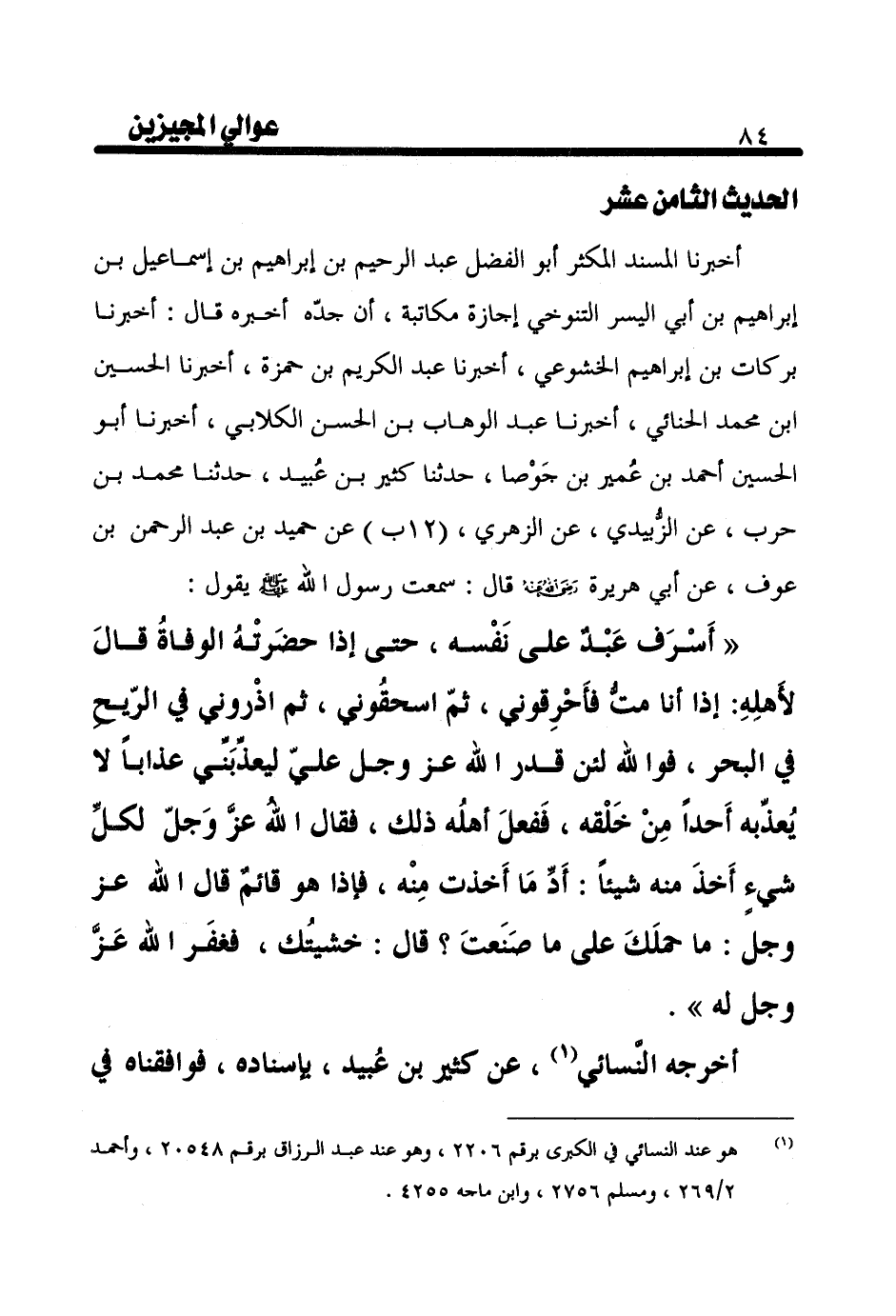 أَخْبَرَنَا الْمُسْنِدُ الْمُكْثِرُ أَبُو الْفَضْلِ عَبْدُ الرَّحِيمِ بْنُ إِبْرَاهِيمَ بْنِ إِسْمَاعِيلَ بْنِ إِبْرَاهِيمَ بْنِ أَبِي الْيَسَرِ التَّنُوخِيُّ إِجَازَةَ مُكَاتَبَةٍ، أَنَّ جَدَّهُ أَخْبَرَهُ، قَالَ: أَخْبَرَنَا بَرَكَاتُ بْنُ إِبْرَاهِيمَ الْخُشُوعِيُّ، أَخْبَرَنَا عَبْدُ الْكَرِيمِ بْنُ حَمْزَةَ، أَخْبَرَنَا الْحُسَيْنُ بْنُ مُحَمَّدٍ الْحِنَّائِيُّ، أَخْبَرَنَا عَبْدُ الْوَهَّابِ بْنُ الْحَسَنِ الْكِلَابِيُّ، أَخْبَرَنَا أَبُو الْحُسَيْنِ أَحْمَدُ بْنُ عُمَيْرِ بْنِ جَوْصَا، حَدَّثَنَا كَثِيرُ بْنُ عُبَيْدٍ، حَدَّثَنَا مُحَمَّدُ بْنُ حَرْبٍ، عَنِ الزُّبَيْدِيِّ، عَنِ الزُّهْرِيِّ، عَنْ حُمَيْدِ بْنِ عَبْدِ الرَّحْمَنِ بْنِ عَوْفٍ، عَنْ أَبِي هُرَيْرَةَ رَضِيَ اللَّهُ عَنْهُ، قَالَ: سَمِعْتُ رَسُولَ اللَّهِ صَلَّى اللَّهُ عَلَيْهِ وَسَلَّمَ، يَقُولُ: " أَسْرَفَ عَبْدٌ عَلَى نَفْسِهِ حَتَّى إِذَا حَضَرَتْهُ الْوَفَاةُ، قَالَ لِأَهْلِهِ: إِذَا أَنَا مِتُّ فَأَحْرِقُونِي، ثُمَّ اسْحَقُونِي، ثُمَّ اذْرُونِي فِي الرِّيحِ فِي الْبَحْرِ، فَوَاللَّهِ لَئِنْ قَدِرَ اللَّهُ عَزَّ وَجَلَّ عَلَيَّ لَيُعَذِّبَنِّي عَذَابًا لَا يُعَذِّبُهُ أَحَدًا مِنْ خَلْقِهِ، فَفَعَلَ أَهْلُهُ ذَلِكَ، فَقَالَ اللَّهُ عَزَّ وَجَلَّ لِكُلِّ شَيْءٍ أَخَذَ مِنْهُ شَيْئًا: أَدِّ مَا أَخَذْتَ مِنْهُ، فَإِذَا هُوَ قَائِمٌ، قَالَ اللَّهُ عَزَّ وَجَلَّ: مَا حَمَلَكَ عَلَى مَا صَنَعْتَ؟ قَالَ: خَشْيَتُكَ، فَغَفَرَ اللَّهُ عَزَّ وَجَلَّ لَهُ ".