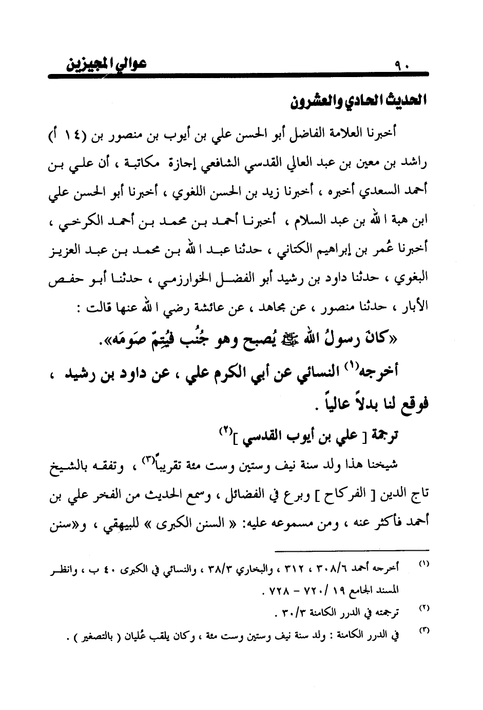 أَخْبَرَنَا الْعَلَّامَةُ الْفَاضِلُ أَبُو الْحَسَنِ عَلِيُّ بْنُ أَيُّوبَ بْنِ مَنْصُورِ بْنِ رَاشِدِ بْنِ مَعِينِ بْنِ عَبْدِ الْعَالِي الْقُدْسِيُّ الشَّافِعِيُّ إِجَازَةَ مُكَاتَبَةٍ، أَنَّ عَلِيَّ بْنَ أَحْمَدَ السَّعْدِيَّ أَخْبَرَهُ، أَخْبَرَنَا زَيْدُ بْنُ الْحَسَنِ اللُّغَوِيُّ، أَخْبَرَنَا أَبُو الْحَسَنِ عَلِيُّ بْنُ هِبَةِ اللَّهِ بْنِ عَبْدِ السَّلَامِ، أَخْبَرَنَا أَحْمَدُ بْنُ مُحَمَّدِ بْنِ أَحْمَدَ الْكَرْخِيِّ، أَخْبَرَنَا عُمَرُ بْنُ إِبْرَاهِيمَ الْكَتَّانِيُّ، حَدَّثَنَا عَبْدُ اللَّهِ بْنُ مُحَمَّدِ بْنِ عَبْدِ الْعَزِيزِ الْبَغَوِيُّ، حَدَّثَنَا دَاوُدُ بْنُ رَشِيدٍ أَبُو الْفَضْلِ الْخُوَارِزْمِيُّ، حَدَّثَنَا أَبُو حَفْصِ الْآبَارُ، حَدَّثَنَا مَنْصُورٌ، عَنْ مُجَاهِدٍ، عَنْ عَائِشَةَ رَضِيَ اللَّهُ عَنْهَا، قَالَتْ: «كَانَ رَسُولُ اللَّهِ صَلَّى اللَّهُ عَلَيْهِ وَسَلَّمَ يُصْبِحُ وَهُوَ جُنُبٌ فَيُتِمُّ صَوْمَهُ» .