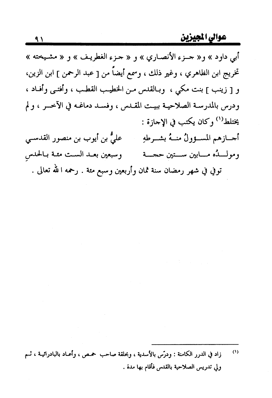 أَجَازَهُمُ الْمَسْئُولُ مِنْهُ بِشَرْطِهِ ... عَلِيُّ بْنُ أَيُّوبَ بْنِ مَنِصُورٍ الْقُدْسِي