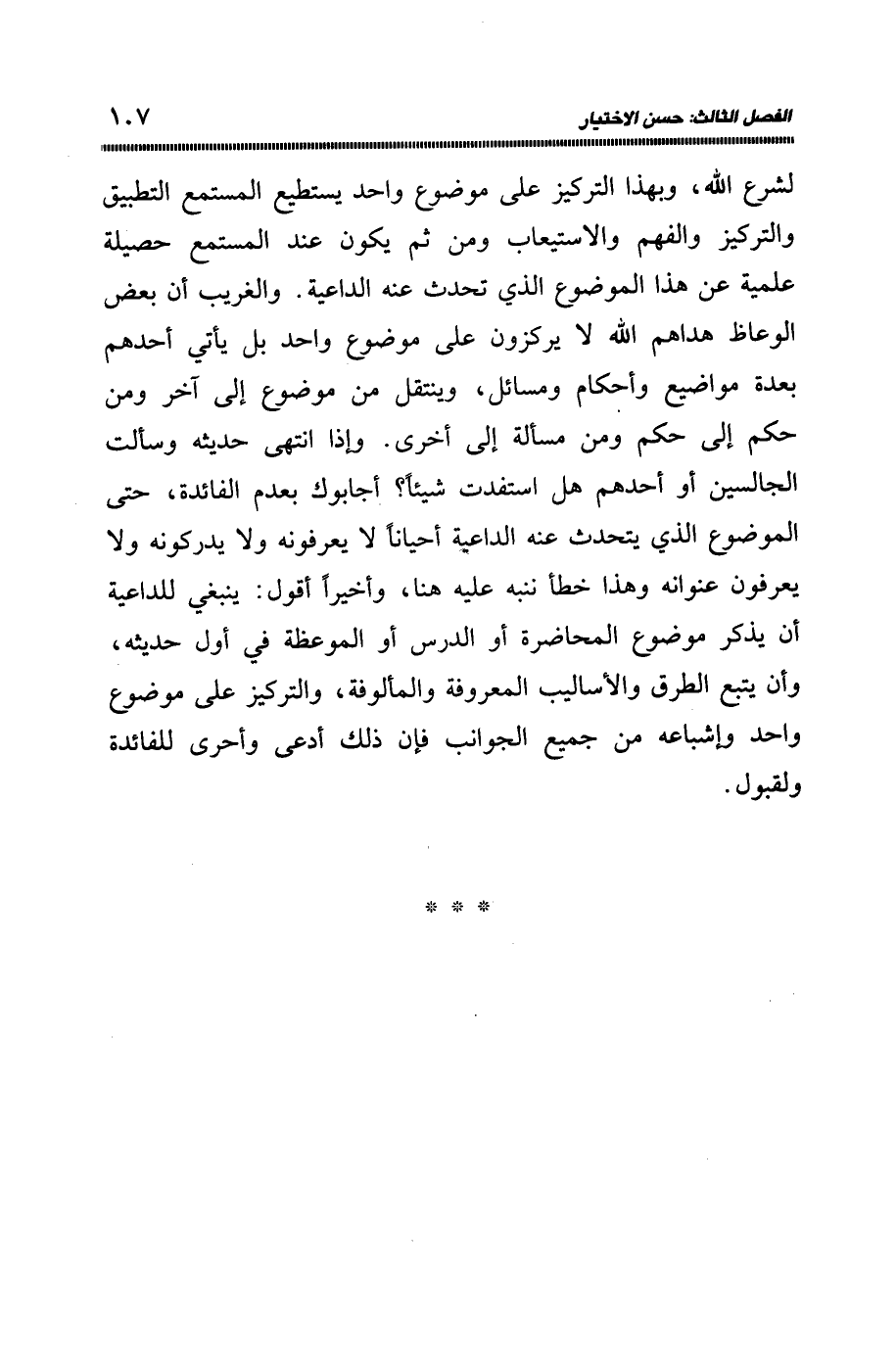 لشرع الله، وبهذا التركيز على موضوع واحد يستطيع المستمع التطبيق، والتركيز والفهم الاستيعاب، ومن ثم يكون عند المستمع حصيلة علمية عن هذا الموضوع الذي تحدث عنه الداعية، والغريب أن بعض الوعاظ هداهم الله لا يركزون على موضوع واحد بل يأتي أحدهم بعدة مواضيع وأحكام ومسائل، وينتقل من موضوع إلى آخر ومن حكم إلى حكم ومن مسألة إلى أخرى، وإذا انهى حديثه وسألت الجالسين، أو أحدهم هل استفدت شيئًا؟ أجابوك بعدم الفائدة، حتى الموضوع الذي يتحدث عنه الداعية أحيانا لا يعرفونه ولا يدركونه، ولا يعرفون عنوانه وهذا خطأ ننبه عليه هنا، وأخيرا أقول: ينبغي للداعية أن يذكر موضوع المحاضرة، أو الدرس أو الموعظة في أول حديثه، وأن يتبع الطرق والأساليب المعروفة والمألوفة، والتركيز على موضوع واحد وإشباعه من جميع الجوانب، فإن ذلك أدعى وأحرى للفائدة والقبول.