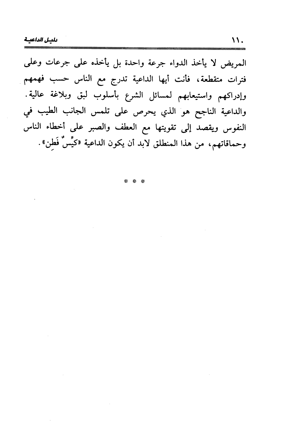 المريض لا يأخذ الدواء جرعة بل يأخذه على جرعات وعلى فترات متقطعة، فأنت أيها الداعية تدرج مع الناس حسب فهمهم، وإدراكهم واستيعابهم لمسائل الشرع بأسلوب لبق وبلاغة عالية.