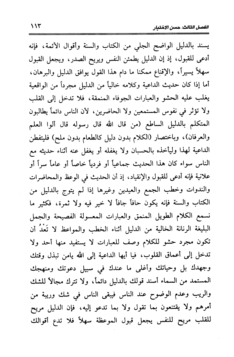 يسند بالدليل الواضح الجلي من الكتاب والسنة وأقوال الأئمة، فإنه أدعى للقبول، إذ إن الدليل يطمئن النفس ويربح الصدر، ويجعل القبول سهلا يسيرًا، والإقناع ممكنا ما دام هذا القول يوافق الدليل والبرهان، أما إذا كان حديث الداعية، وكلامه خاليًا من الدليل مجردًا من الواقعية يغلب عليه الحشو والعبارات الجوفاء المنمقة، فلا تدخل إلى القلب ولا تؤثر في نفوس المستمعين ولا الحاضرين؛ لأن الناس دائما يطالبون المتكلم بالدليل الساطع "من قال الله قال رسوله قال ألوا العلم والعرفان"، وباختصار "الكلام بدون دليل كالطعام بدون ملح"، فليتفطن الداعية لهذا، وليأخذه بالحسبان ولا يغفله أو يغفل عنه أثناء حديثه مع الناس سواء كان هذا الحديث جماعيًّا، أو فرديًّا خاصًّا أو عاما سرا أو علانية فإنه أدعى للقبول والانقياد، إذ إن الحديث في الوعظ والمحاضرات والندوات، وخطب الجمع والعيدين وغيرها إذا لم يتوج بالدليل من الكتاب والسنة، فإنه يكون حافًّا جافًّا لا خير ولا ثمرة، فكثير ما نسمع الكلام الطويل المنمق، والعبارات المعسولة الفصيحة والجمل البليغة الرنانة الخالية من الدليل أثناء الخطب، والمواعظ لا تعد أن تكون مجرد حشو للكلام، وصف للعبارات لا يستفيد منها أحد، ولا تدخل إلى أعماق القلوب، فيا أيها الداعية إلى الله يا من تبذل وقتك، وجهدك بل وحياتك وأغلى ما عندك في سبيل دعوتك، ومنهجك المستمد من السماء أسند قولك بالدليل دائمًا، ولا تترك مجالًا للشك والريب، وعدم الوضوح عند الناس، فيبقى الناس في شك وريبة من أمرهم ولا يقتنعون بما تقول ولا بما تدعو إليه، فإن الدليل مريح للقلب مريح للنفس يجعل قبول الموعظة سهلًا فلا تدع أقوالك