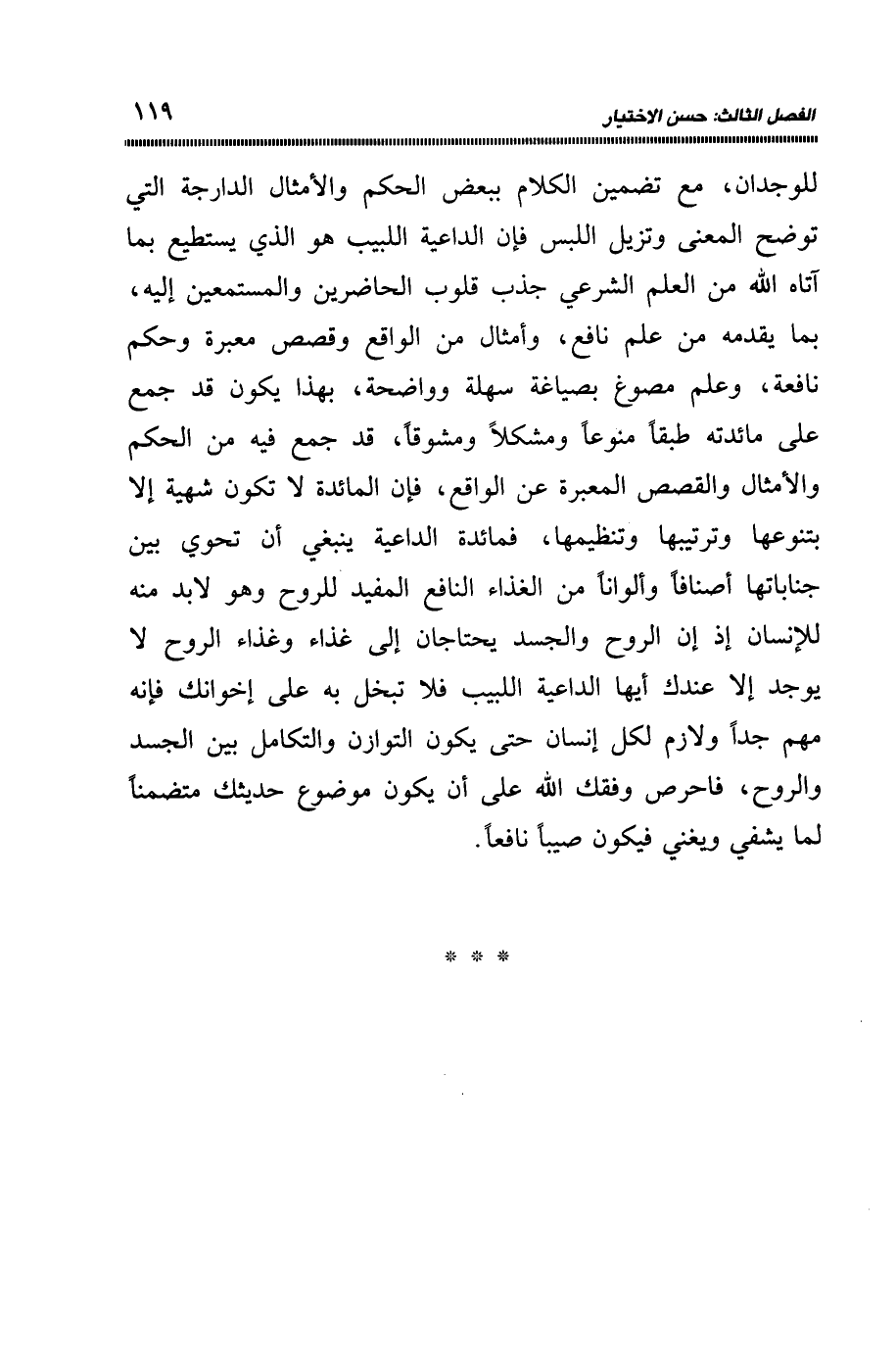 للوجدان، مع تضمين الكلام ببعض الحكم، والأمثال الدارجة التي توضح المعنى وتزيل اللبس، فإن الداعية اللبيب هو الذي يستطيع بما آتاه الله من العلم الشرعي جذب قلوب الحاضرين والمستمعين إليه، بما يقدمه من علم نافع، وأمثال من الواقع وقصص معبرة وحكم نافعة، وعلم مصوغ بصياغة سهلة وواضحة، بهذا يكون قد جمع على مائدته طبقا منوعا ومشكلًا ومشوقًا، قد جمع فيه من الحكم والأمثال، والقصص المعبرة عن الواقع، فإن المائدة لا تكون شهية إلا بتنوعها وترتيبها وتنظيمها، فمائدة الداعية ينبغي أن تحوي بين جناباتها أصنافًا وألوانًا من الغذاء النافع المفيد للروح، وهو لا بد منه للإنسان إذ إن الروح، والجسد يحتاجان إلى غذاء، وغذاء الروح لا يوجد إلا عندك أيها الداعية اللبيب، فلا تبخل به على إخوانك، فإنه مهم جدًّا ولازم لكل إنسان حتى يكون التوازن، والتكامل بين الجسد والروح، فاحرص وفقك الله على أن يكون موضوع حديثك متضمنًا لما يشفي ويغني فيكون صيبًا نافعًا.