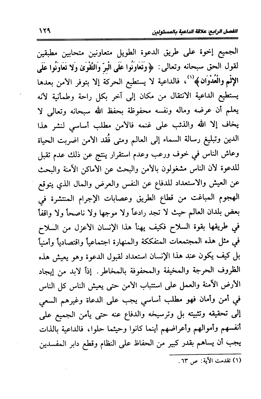الجميع إخوة على طريق الدعوة الطويل متعاونين متحابين مطبقين لقول الحق سبحانه وتعالى: {وَتَعَاوَنُوا عَلَى الْبِرِّ وَالتَّقْوَى وَلا تَعَاوَنُوا عَلَى الإِثْمِ وَالْعُدْوَانِ} 1، فالداعية لا يستطيع الحركة إلا بتوفر الأمن بعدها يستطيع الداعية الانتقال من مكان إلى آخر بكل راحة وطمأنية؛ لأنه يعلم أن عرضه وماله ونفسه محفوظة بحفظ الله سبحانه وتعالى لا يخاف إلا الله، والذئب على غنمه فالأمن مطلب أساسي لنشر هذا الدين، وتبليغ رسالة السماء إلى العالم ومتى فقد الأمن اضطربت الحياة، وعاش الناس في خوف ورعب، وعدم استقرار ينتج عن ذلك عدم تقبل للدعوة؛ لأن الناس مشغولون بالأمن والبحث عن الأماكن الآمنة، والبحث عن العيش والاستعداد للدفاع عن النفس، والعرض والمال الذي يتوقع الهجوم المباغت من قطاع الطريق، وعصابات الإجرام المنتشرة في بعض بلدان العالم حيث لا تجد رادعا ولا موجها ولا ناصحا، ولا واقفا في طريقها بقوة السلاح، فكيف يهنأ هذا الإنسان الأعزل من السلاح في مثل هذه المجتمعات المتفككة، والمنهارة اجتماعيًّا واقتصاديًّا وأمنيًّا بل كيف يكون عند هذا الإنسان استعداد لقبول الدعوة، وهو يعيش هذه الظروف الحرجة والمخيفة والمحفوفة بالمخاطر إذًا لا بد من إيجاد الأرض الآمنة، والعمل على استتباب الأمن حتى يعيش الناس كل الناس في أمن وأمان، فهو مطلب أساسي يجب على الدعاة وغيرهم السعي إلى تحقيقه، وتثبيته بل وترسيخه والدفاع عنه حتى يأمن الجميع على أنفسهم، وأموالهم وأعراضهم أينما كانوا وحيثما حلوا، فالداعية بالذات يجب أن يساهم بقدر كبير من الحفاظ على النظام، وقطع دابر المفسدين