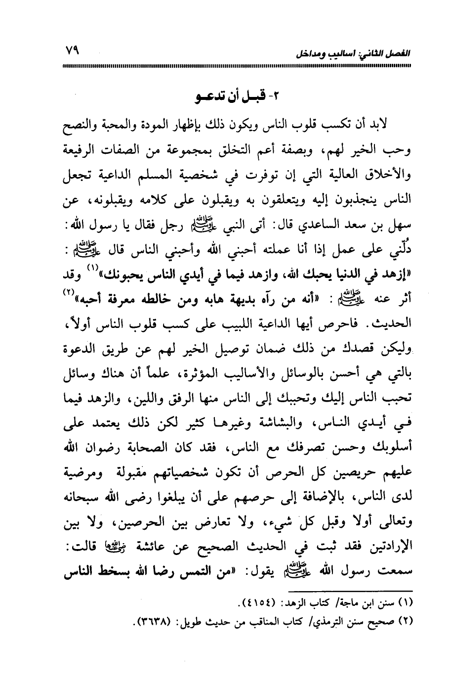 لا بد أن تكسب قلوب الناس ويكون ذلك بإظهار المودة، والمحبة والنصح وحب الخير لهم، وبصفة أعم التخلق بمجموعة من الصفات الرفيعة والأخلاق العالية التي إن توفرت في شخصية المسلم الداعية تجعل الناس ينجذبون إليه، ويتعلقون به ويقبلون على كلامه ويقبلونه، عن سهل بن سعد الساعدي قال: أتى النبي -صلى الله عليه وسلم- رجل فقال: يا رسول الله دلني على عمل إذا أنا عملته أحبني الله، وأحبني الناس قال -صلى الله عليه وسلم: "ازهد في الدنيا يحبك الله، وازهد فيما في أيدي الناس يحبونك" 1، وقد أثر عنه -صلى الله عليه وسلم: "أنه من رآه بديهة هابه ومن خالطه معرفة أحبه" 2 الحديث. فاحرص أيها الداعية اللبيب على كسب قلوب الناس أولًا، وليكن قصدك من ذلك ضمان توصيل الخير لهم عن طريق الدعوة بالتي هي أحسن بالوسائل والأساليب المؤثر، علمًا أن هناك وسائل تحبب الناس إليك، وتحببك إلى الناس منها الرفق واللين، والزهد فيما في أيدي الناس، والبشاشة وغيرها كثير لكن ذلك يعتمد على أسلوبك وحسن تصرفك مع الناس، فقد كان الصحابة -رضوان الله عليهم- حريصين كل الحرص أن تكون شخصياتهم مقبولة ومرضية لدى الناس، بالإضافة إلى حرصهم على أن يبلغوا رضى الله سبحانه وتعالى أولا وقبل كل شيء، ولا تعارض بين الحرصين، ولا بين الإرادتين فقد ثبت في الحديث الصحيح عن عائشة -رضي الله عنها- قالت: سمعت رسول الله -صلى الله عليه وسلم- يقول: "من التمس رضا الله بسخط الناس