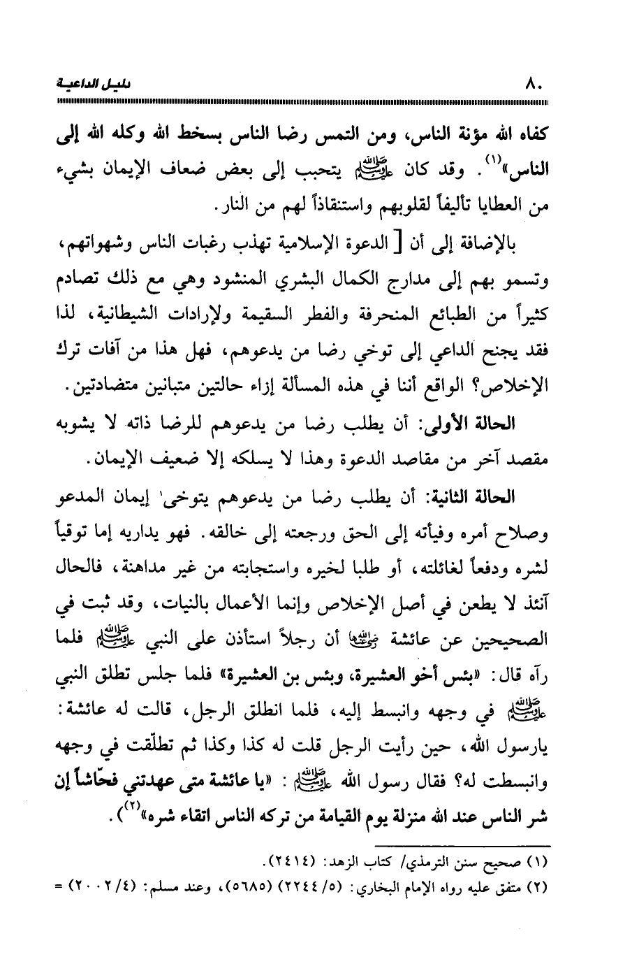 الحالة الثانية: أن يطلب رضا من يدعوهم يتوخى إيمان المدعو، وصلاح أمره وفيأته إلى الحق ورجعته إلى خالقه، فهو يداريه إما توقيا لشره ودفعا لغائلته، أو طلبا لخيره واستجابته من غير مداهنة، فالحال آنئذ لا يطعن في أصل الإخلاص وإنما الأعمال بالنيات، وقد ثبت في الصحيحين عن عائشة -رضي الله عنها- أن رجلًا استأذن على النبي -صلى الله عليه وسلم- فلما رآه قال: "بئس أخو العشيرة، وبئس بن العشيرة". فلما جلس تطلق النبي -صلى الله عليه وسلم- في وجهه وانبسط إليه، فلما انطلق الرجل، قالت له عائشة: يا رسول الله، حين رأيت الرجل قلت له كذا وكذا، ثم تطلقت في وجهه وانبسطت له؟ فقال رسول الله -صلى الله عليه وسلم: "يا عائشة متى عهدتني فحاشا إن شر الناس عند الله منزلة يوم القيامة من تركه الناس اتقاء شره" 2.