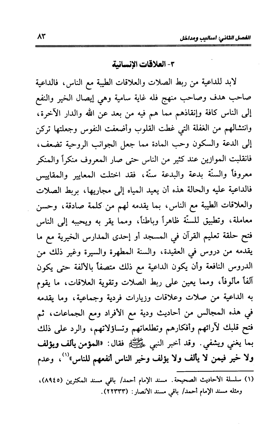 لا بد للداعية من ربط الصلات والعلاقات الطيبة مع الناس، فالداعية صاحب هدف وصاحب منهج فله غاية سامية، وهي إيصال الخير والنفع إلى الناس كافة، وإنقاذهم مما هم فيه من بعد عن الله والدار الآخرة، وانتشالهم من الغفلة التي غطت القلوب، وأضعفت النفوس وجعلتها تركن إلى الدعة والسكون وحب المادة مما جعل الجوانب الروحية تضعف، فانقلبت الموازين عند كثير من الناس حتى صار المعروف منكرًا والمنكر معروفًا والسنة بدعة والبدعة سنة، فقد اختلت المعايير والمقاييس فالداعية عليه والحالة هذه أن يعيد المياه إلى مجاريها، بربط الصلات، والعلاقات الطيبة مع الناس، بما يقدمه لهم من كلمة صادقة، وحسن معاملة، وتطبيق للسنة ظاهرًا وباطنًا، ومما يقربه ويحببه إلى الناس فتح حلقة تعليم القرآن في المسجد، أو إحدى المدارس الخيرية مع ما يقدمه من دروس في العقيدة، والسنة المطهرة والسيرة وغير ذلك من الدروس النافعة وأن يكون الداعية مع ذلك متصفا بالألفة حتى يكون آلفًا مألوفًا، ومما يعين على ربط الصلات وتقوية العلاقات، ما يقوم به الداعية من صلات، وعلاقات وزيارات فردية وجماعية، وما يقدمه في هذه المجالس من أحاديث ودية مع الأفراد ومع الجماعات، ثم فتح قلبك لآرائهم وأفكارهم وتطلعاتهم وتساؤلاتهم، والرد على ذلك بما يغني ويشفي. وقد أخبر النبي -صلى الله عليه وسلم- فقال: "المؤمن يألف ويؤلف ولا خير فيمن لا يألف، ولا يؤلف وخير الناس أنفعهم للناس" 1، وعدم