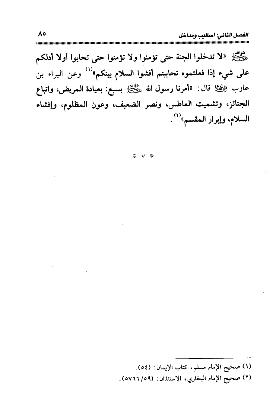 -صلى الله عليه وسلم: "لا تدخلوا الجنة حتى تؤمنوا، ولا تؤمنوا حتى تحابوا أولا أدلكم على شيء إذا فعلتموه تحاببتم أفشوا السلام بينكم" 1، وعن البراء بن عازب -رضي الله عنهما- قال: "أمرنا رسول الله -صلى الله عليه وسلم- بسبع: بعيادة المريض، واتباع الجنائز، وتشميت العاطس، ونصر الضعيف، وعون المظلوم، وإفشاء السلام، وإبرار المقسم"2.