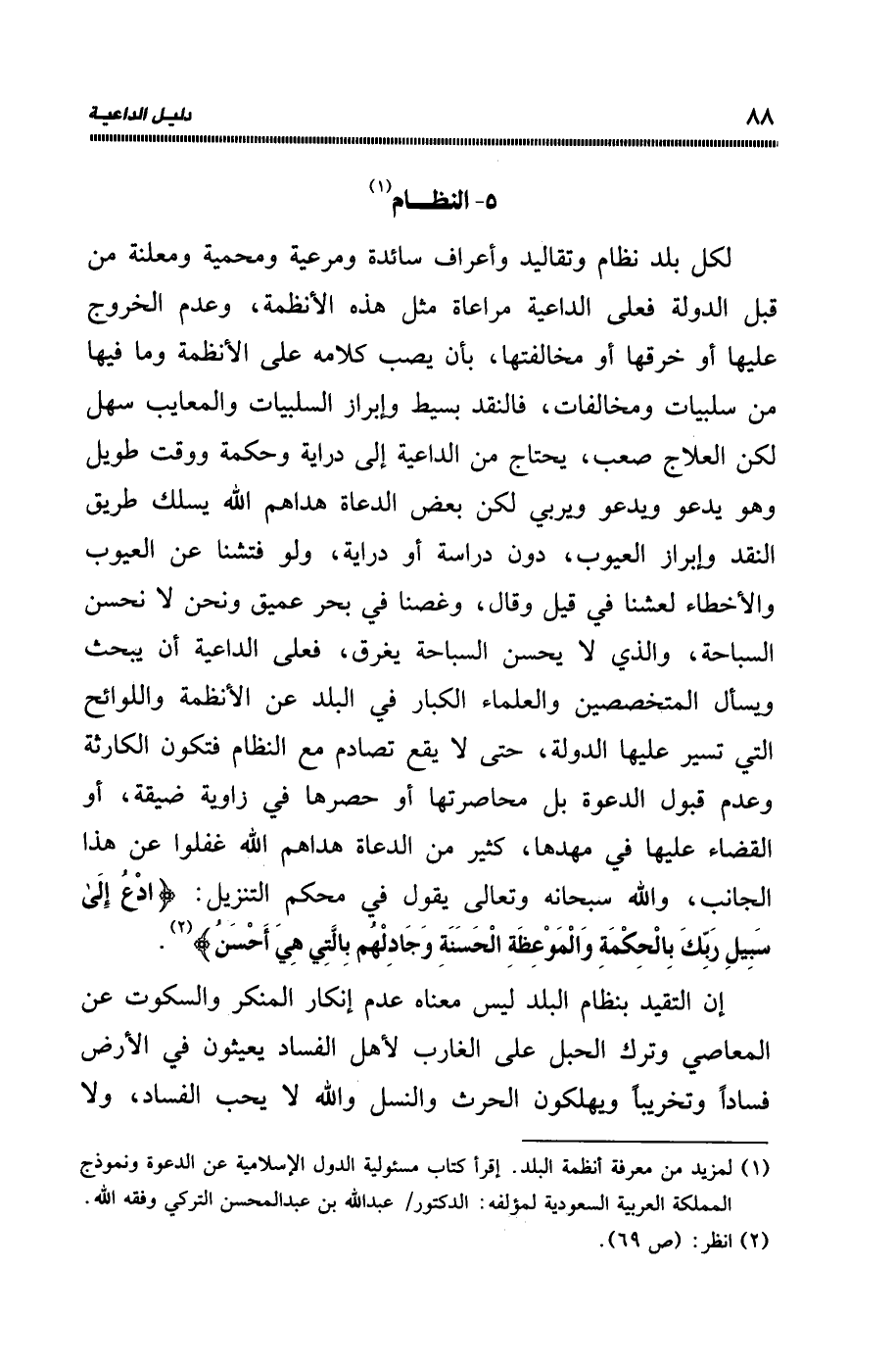 1 لمزيد من معرفة أنظمة البلد. اقرأ كتاب مسئولية الدولة الإسلامية عن الدعوة، ونموذج المملكة العربية السعودية لمؤلفه: الدكتور/ عبد الله بن عبد المحسن التركي وفقه الله.
