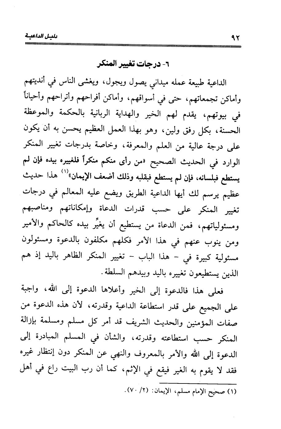 الداعية طبيعة عمله ميداني يصول ويجول، ويغشى الناس في أنديتهم وأماكن تجمعاتهم، حتى في أسواقهم، وأماكن أفراحهم وأتراحهم وأحيانًا في بيوتهم، يقدم لهم الخير والهداية الربانية بالحكمة والموعظة الحسنة، بكل رفق ولين، وهو بهذا العمل العظيم يحسن به أن يكون على درجة عالية من العلم والمعرفة، وخاصة بدرجات تغيير المنكر الوارد في الحديث الصحيح: "من رأى منكم منكرا فليغيره بيده فإن لم يستطع فبلسانه، فإن لم يستطع فبقلبه، وذلك أضعف الإيمان" 1، هذا حديث عظيم يرسم لك أيها الداعية الطريق، ويضع عليه المعالم في درجات تغيير المنكر على حسب قدرات الدعاة، وإمكاناتهم ومناصبهم ومسئولياتهم، فمن الدعاة من يستطيع أن يغير بيده كالحاكم، والأمير ومن ينوب عنهم في هذا الأمر فكلهم مكلفون بالدعوة، ومسئولون مسئولية كبيرة في -هذا الباب- تغيير المنكر الظاهر باليد إذ هم الذين يستطيعون تغييره باليد وبيدهم السلطة.
