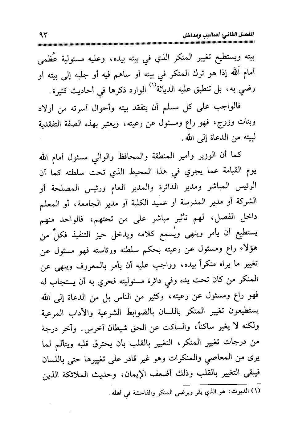 بيته ويستطيع تغيير المنكر الذي في بيته بيده، وعليه مسئولية عظمى أمام الله إذا هو ترك المنكر في بيته، أو ساهم فيه أو جلبه إلى بيته أو رضي به، بل تنطبق عليه الدياثة1 الوارد ذكرها في أحاديث كثيرة.