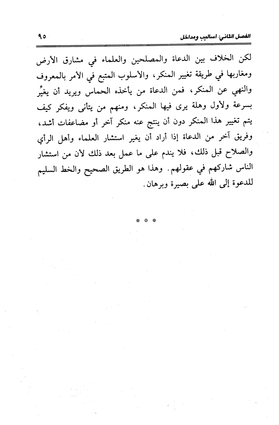 لكن الخلاف بين الدعاة والمصلحين، والعلماء في مشارق الأرض ومغاربها في طريقة تغيير المنكر، والأسلوب المتبع في الأمر بالمعروف والنهي عن المنكر، فمن الدعاة من يأخذه الحماس ويريد أن يغير بسرعة ولأول وهلة يرى فيها المنكر، ومنهم من يتأنى ويفكر كيف يتم تغيير هذا المنكر دون أن ينتج عنه منكر آخر أو مضاعفات أشد، وفريق آخر من الدعاة إذا أراد أن يغير استشار العلماء وأهل الرأي والصلاح قبل ذلك، فلا يندم على ما عمل بعد ذلك؛ لأن من استشار الناس شاركهم في عقولهم، وهذا هو الطريق الصحيح والخط السليم للدعوة إلى الله على بصيرة وبرهان.