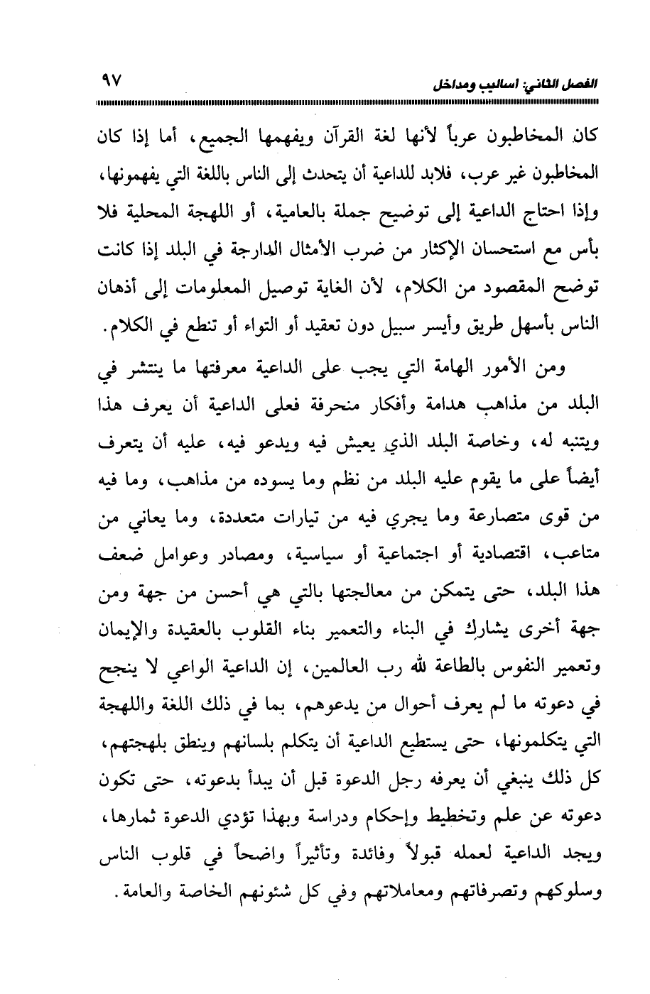 كان المخاطبون عربًا؛ لأنها لغة القرآن ويفهمها الجميع، أما إذا كان المخاطبون غير عرب، فلا بد للداعية أن يتحدث إلى الناس باللغة التي يفهمونها، وإذا احتاج الداعية إلى توضيح جملة بالعامية، أو اللهجة المحلية فلا بأس مع استحسان الإكثار من ضرب الأمثال الدارجة في البلد إذا كانت توضح المقصود من الكلام؛ لأن الغاية توصيل المعلومات إلى أذهان الناس بأسهل طريق وأيسر سبيل دون تعقيد، أو التواء أو تنطع في الكلام.