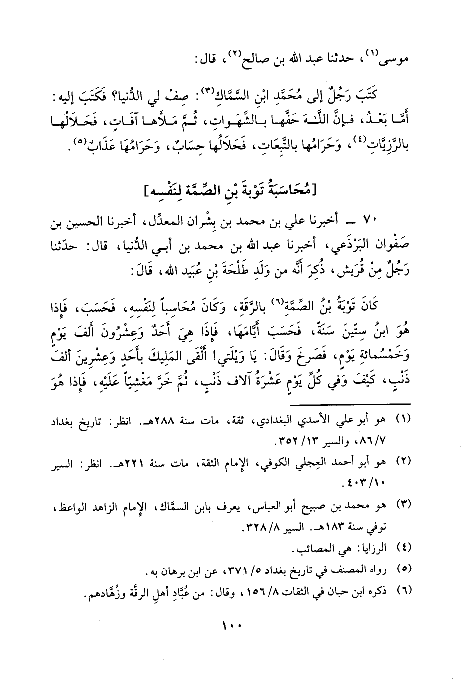 70 - أَخْبَرَنَا عَلِيُّ بْنُ مُحَمَّدِ بْنِ بِشْرَانَ الْمُعَدَّلُ، أَخْبَرَنَا الْحُسَيْنُ بْنُ صَفْوَانَ الْبَرْذَعِيُّ، أَخْبَرَنَا عَبْدُ اللَّهِ بْنُ مُحَمَّدِ بْنِ أَبِي الدُّنْيَا، قَالَ: حَدَّثَنَا رَجُلٌ مِنْ قُرَيْشٍ، ذُكِرَ أَنَّهُ مِنْ وَلَدِ طَلْحَةَ بْنِ عُبَيْدِ اللَّهِ، قَالَ: " كَانَ تَوْبَةُ بْنُ الصِّمَّةِ بِالرَّقَةِ، وَكَانَ مُحَاسِبًا لِنَفْسِهِ، فَحَسَبَ، فَإِذَا هُوَ ابْنُ سِتِّينَ سَنَةً، فَحَسَبَ أَيَّامَهَا، فَإِذَا هِيَ أَحَدٌ وَعِشْرُونَ أَلفَ يَوْمٍ وَخَمْسُ مِائَةِ يَوْمٍ، فَصَرَخَ وَقَالَ: يَا وَيْلَتِي أَلْقَى الْمَلِيكَ بِأَحَدٍ وَعَشْرِينَ أَلْفَ ذَنْبٍ، كَيْفَ وَفِي كُلِّ يَوْمٍ عَشْرَةُ آلَافِ ذَنْبٍ "، ثُمَّ خَرَّ مَغْشِيًّا عَلَيْهِ، فَإِذَا هُوَ