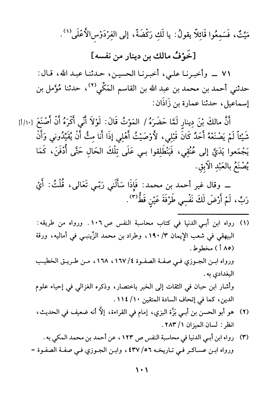 71 - وَأَخْبَرَنَا عَلِيٌّ، أَخْبَرَنَا الْحُسَيْنُ، حَدَّثَنَا عَبْدُ اللَّهِ، قَالَ: حَدَّثَنِي أَحْمَدُ بْنُ مُحَمَّدِ بْنِ عَبْدِ اللَّهِ بْنِ الْقَاسِمِ الْمَكِّيُّ، حَدَّثَنَا مُؤَمَّلُ بْنُ إِسْمَاعِيلَ، حَدَّثَنَا عِمَارَةُ بْنُ زَاذَانَ، أَنَّ مَالِكَ بْنَ دِينَارٍ، لَمَّا حَضَرَهُ الْمَوْتُ، قَالَ: " لَوْلَا أَنِّي أَكْرَهُ أَنْ أَصْنَعَ شَيْئًا لَمْ يَصْنَعَهُ أَحَدٌ كَانَ قَبْلي، لَأَوْصَيْتُ أَهْلِي إِذَا أَنَا مِتُّ، أَنْ يُقَيِّدُونِي، وَأَنْ يَجْمَعُوا يَدَيَّ إِلَى عُنَقِي، فَيَنْطَلِقُوا بِي عَلَى تِلْكَ الْحَالِ حَتَّى أُدْفَنَ، كَمَا يُصْنَعُ بِالْعَبْدِ الْآبِقِ " وَقَالَ غَيْرُ أَحْمَدَ بْنِ مُحَمَّدٍ: " فَإِذَا سَأَلَنِي رَبِّي تَعَالَى، قُلْتُ: أَيْ رَبِّ، لَمْ أَرْضَ لَكَ نَفْسِي طَرْفَةَ عَيْنٍ قَطُّ "