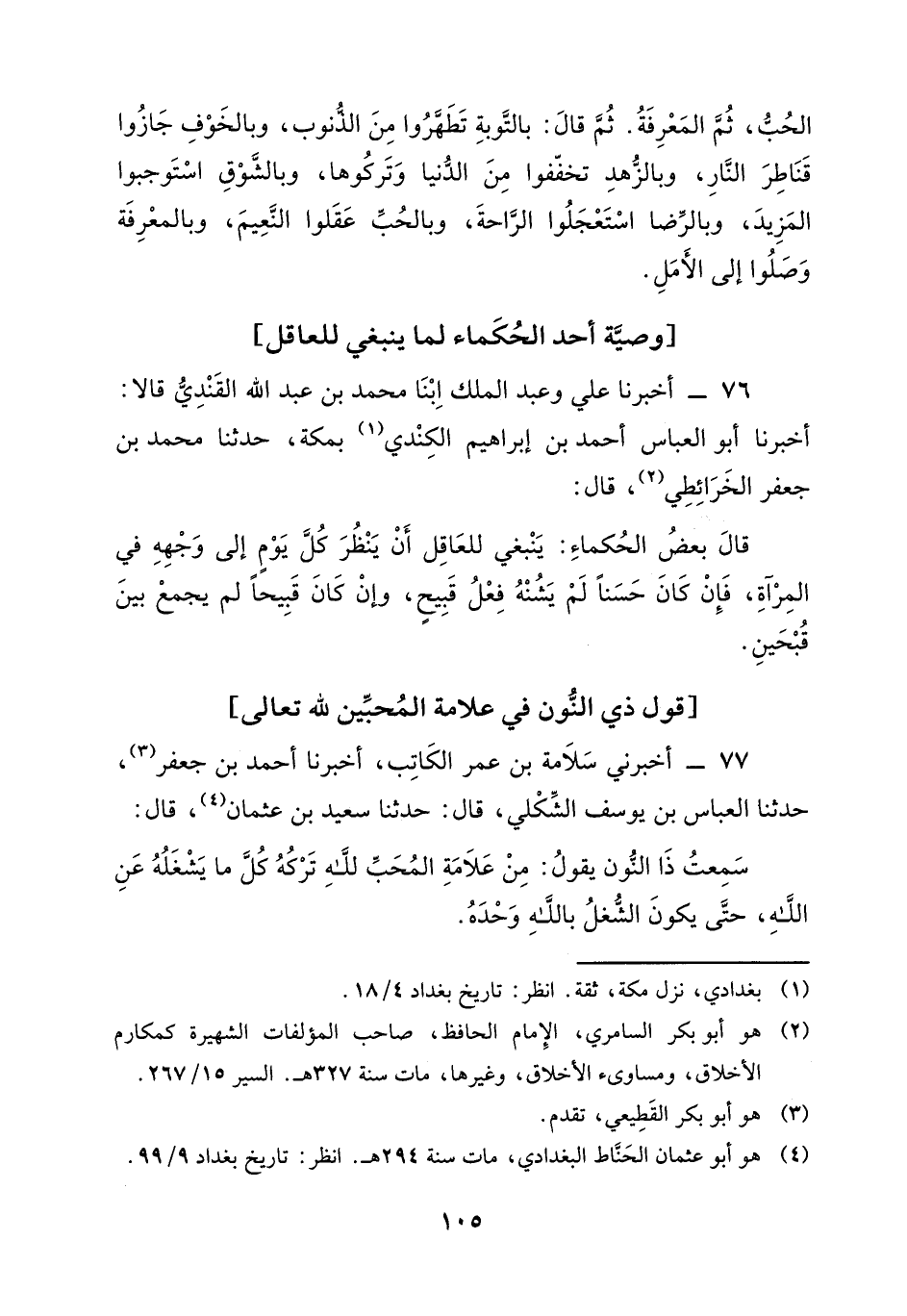 77 - أَخْبَرَنِي سَلَامَةُ بْنُ عُمَرَ الْكَاتِبُ، أَخْبَرَنَا أَحْمَدُ بْنُ جَعْفَرٍ، حَدَّثَنَا الْعَبَّاسُ بْنُ يُوسُفَ الشِّكْلِيُّ، قَالَ: حَدَّثَنَا سَعِيدُ بْنُ عُثْمَانَ، قَالَ: سَمِعْتُ ذَا النُّونِ، يَقُولُ: " مِنْ عَلَامَةِ الْمُحِبِّ لِلَّهِ تَرْكُهُ كُلَّ مَا يَشْغَلُهُ عَنَ اللَّهِ، حَتَّى يَكُونَ الشَّغْلُ بِاللَّهِ وَحْدَهُ "