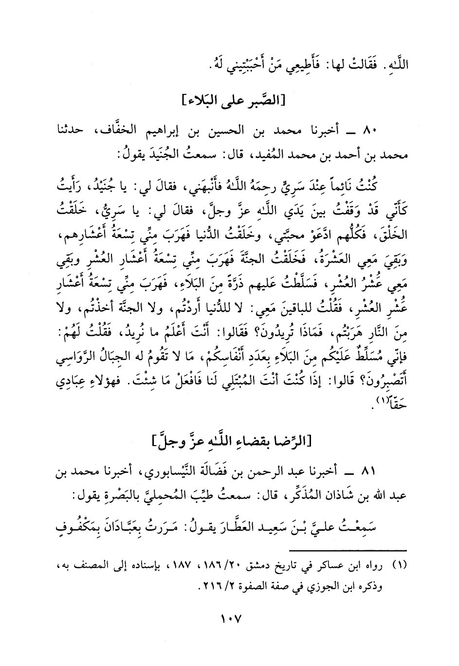80 - أَخْبَرَنَا مُحَمَّدُ بْنُ الْحُسَيْنِ بْنِ إِبْرَاهِيمَ الْخَفَّافُ، حَدَّثَنَا مُحَمَّدُ بْنُ أَحْمَدَ بْنِ مُحَمَّدٍ الْمُفِيدُ، قَالَ: سَمِعْتُ الْجُنَيْدَ، يَقُولُ: كُنْتُ نَائَمًا عِنْدَ سَرِيٍّ رَحِمَهُ اللَّهُ فَأَنْبَهَنِي، فَقَالَ لِي: " يَا جُنَيْدُ، رَأَيْتُ كَأَنِّي قَدْ وَقَفْتُ بَيْنَ يَدَيِ اللَّهِ عَزَّ وَجَلَّ، فَقَالَ لِي: يَا سَرِيُّ، خَلَقْتُ الْخَلْقَ، فَكُلُّهُمُ ادَّعُوا مَحَبَّتِي، وَخَلَقْتُ الدُّنْيَا، فَهَرَبَ مِنِّي تِسْعَةُ أَعْشَارِهِمْ، وَبَقِيَ مَعِي الْعَشَرَةُ، فَخَلَقْتُ الْجَنَّةَ فَهَرَبَ مِنِّي تِسْعَةُ أَعْشَارِ الْعُشْرِ وَبَقِيَ مَعِي عُشْرُ الْعُشْرِ، فَسَلَّطْتُ عَلْيِهِمْ ذَرَّةً مِنَ الْبَلَاءِ، فَهَرَبَ مِنِّي تِسْعَةُ أَعْشَارِ عُشْرِ الْعُشْرِ، فَقُلُتُ لِلْبَاقِينَ مَعِي: لَا لِلدُّنْيَا أَرَدْتُمْ، وَلَا الْجَنَّةَ أَخَذْتُمُ، وَلَا مِنَ النَّارِ هَرَبْتُمْ، فَمَاذَا تُرِيدُونَ؟ فَقَالُوا: أَنْتَ أَعْلَمُ بِمَا نُرِيدُ، فَقُلْتُ لَهُمْ: فَإِنِّي مُسَلِّطٌ عَلَيْكُمْ مِنَ الْبَلَاءِ بِعَدَدِ أَنْفَاسِكُمْ، مَا لَا تَقُومُ لَهُ الْجِبَالُ الرَّوَاسِي أَتَصْبِرُونَ؟ قَالُوا: إِذَا كُنْتَ أَنْتَ الْمُبْتَلِي لَنَا فَافْعَلْ مَا شِئْتَ فَهُؤُلَاءِ عِبَادِي حَقًّا "