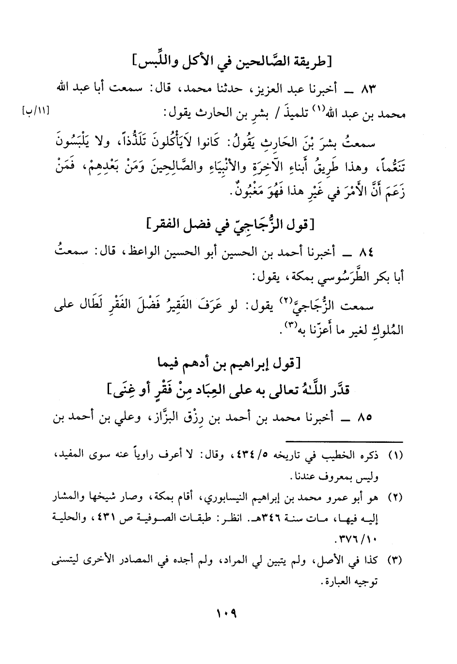 83 - أَخْبَرَنَا عَبْدُ الْعَزِيزِ، حَدَّثَنَا مُحَمَّدٌ، قَالَ: سَمِعْتُ أَبَا عَبْدِ اللَّهِ مُحَمَّدَ بْنَ عَبْدِ اللَّهِ تِلْمِيذَ بِشْرِ بْنِ الْحَارِثِ، يَقُولُ: سَمِعْتُ بِشرَ بْنَ الْحَارِثِ، يَقُولُ: " كَانوا لا يَأْكُلُونَ تَلَذُّذًا، وُلا يَلْبَسُونَ تَنَعُّمًا، وَهَذَا طَرِيقُ أَبْنَاءِ الْآخِرَةِ، وَالْأَنْبِيَاءِ الصَّالِحِينَ، وَمَنْ بَعْدِهِمْ، فَمَنْ زَعَمَ أَنَّ الْأَمْرَ فِي غَيْرِ هَذَا فَهُوَ مَغْبُونٌ "