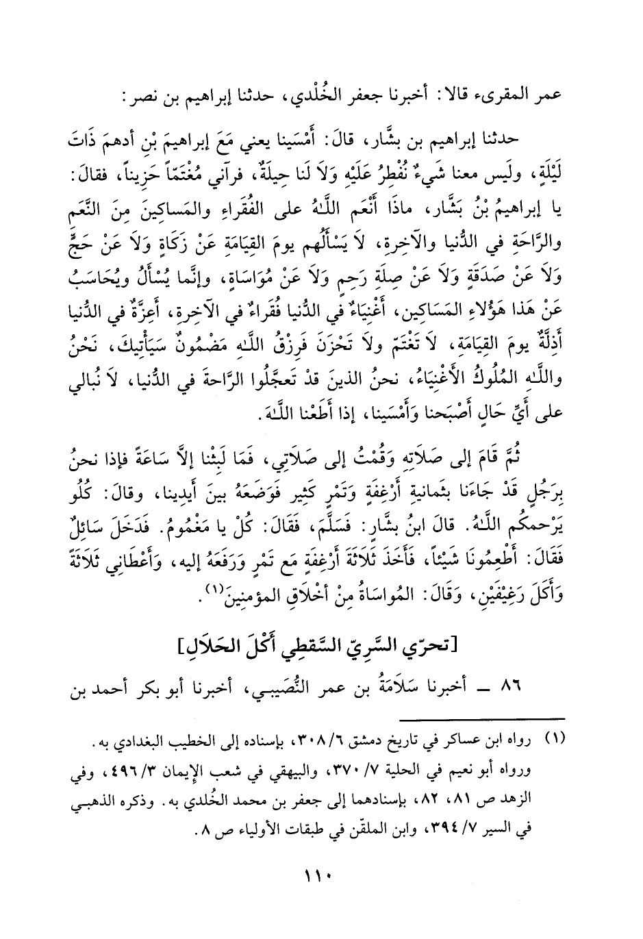 عُمَرَ الْمُقْرِئُ، قَالَا: أَخْبَرَنَا جَعْفَرُ الْخُلْدِيُّ، حَدَّثَنَا إِبْرَاهِيمُ بْنُ نَصْرٍ، حَدَّثَنَا إِبْرَاهِيمُ بْنُ بَشَّارٍ، قَالَ: أَمْسَيْنَا يَعْنِي مَعَ إِبْرَاهِيمَ بْنِ أَدْهَمَ ذَاتَ لَيْلَةٍ، وَلَيْسَ مَعَنَا شَيْءٌ نُفْطِرُ عَلَيْهِ، وَلَا لَنَا حِيَلةٌ، فَرَآنِي مُغْتَمًّا حَزِينًا، فَقَالَ: " يَا إِبْرَاهِيمُ بْنُ بَشَّارٍ، مَاذَا أَنْعَمَ اللَّهُ عَلَى الْفُقَرَاءِ، وَالْمَسَاكِينِ مِنَ النِّعَمِ وَالرَّاحَةِ فِي الدُّنْيَا وَالْآخِرَةِ، لَا يَسْأَلُهُمْ يَوْمَ الْقِيَامَةِ عَنْ زَكَاةٍ، وَلَا عَنْ حَجٍّ، وَلَا عَنْ صَدَقَةٍ، وَلَا عَنْ صِلَةِ رَحِمٍ، وَلَا عَنْ مُوَاسَاةٍ، وَإِنَّمَا يُسْأَلُ وَيُحَاسَبُ عَنْ هَذَا هَؤُلَاءِ الْمَسَاكِينُ، أَغْنِيَاءٌ فِي الدَّنْيَا فُقَرَاءٌ فِي الْآخِرَةِ، أَعِزَّةٌ فِي الدُّنْيَا أَذِلَّةٌ يَوْمَ الْقِيَامَةِ، لَا تَغْتَمَّ وَلَا تَحْزَنْ فَرِزْقُ اللَّهِ مَضْمُونٌ سَيَأْتِيكَ، نَحْنُ وَاللَّهِ الْمُلُوكُ الْأَغْنِيَاءُ، نَحْنُ الَّذِينَ قَدْ تَعَجَّلُوا الرَّاحَةَ فِي الدُّنْيَا، لَا نُبَالِي عَلَى أَيِّ حَالٍ أَصْبَحْنَا وَأَمْسَيْنَا، إِذَا أَطَعْنَا اللَّهَ " ثُمَّ قَامَ إِلَى صَلَاتِهِ وَقُمْتُ إِلَى صَلَاتِي، فَمَا لَبِثْنَا إِلَّا سَاعَةً، فَإِذَا نَحْنُ بِرَجُلٍ قَدْ جَاءَنَا بِثَمَانِيَةِ أَرْغِفَةٍ وَتَمْرٍ كَثِيرٍ، فَوَضَعَهُ بَيْنَ أَيِدِينَا، وَقَالَ: كُلُوا يَرْحَمْكُمُ اللَّهُ قَالَ ابْنُ بَشَّارٍ، فَسَلَّمَ، فَقَالَ: " كُلْ يَا مَغْمُومُ "، فَدَخَلَ سَائِلٌ فَقَالَ: أَطْعِمُونَا شَيْئًا، فَأَخَذَ ثَلَاثَةَ أَرْغِفَةٍ مَعَ تَمْرٍ وَرَفَعَهُ إِلَيْهِ، وَأَعْطَانِي ثَلَاثَةً وَأَكَلَ رَغِيفَيْنِ، وَقَالَ: " الْمُوَاسَاةُ مِنْ أَخْلَاقِ الْمُؤْمِنِينَ "
