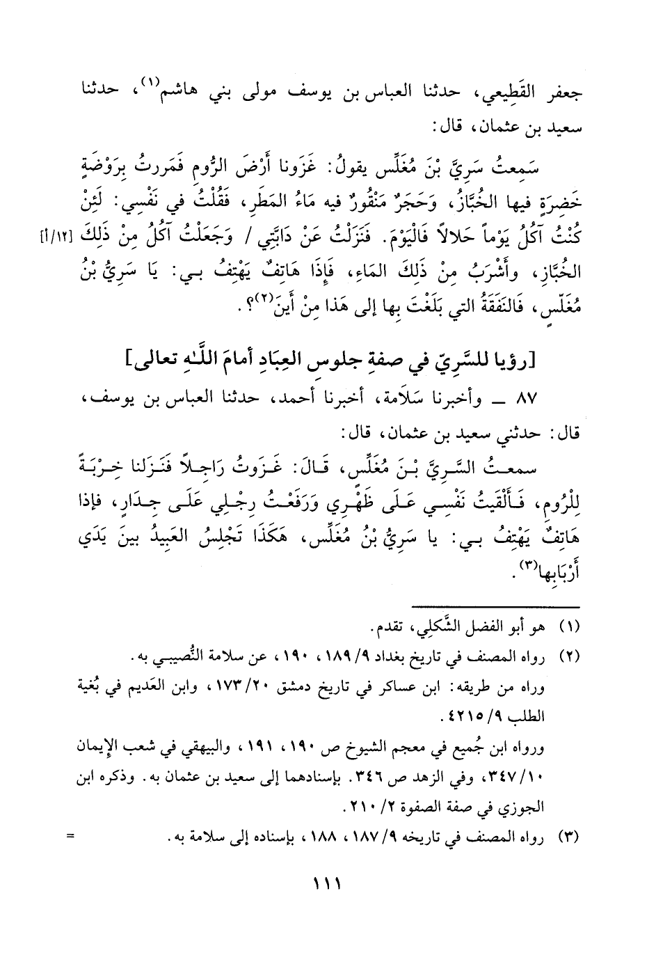 87 - وَأَخْبَرَنَا سَلَامَةُ، أَخْبَرَنَا أَحْمَدُ، حَدَّثَنَا الْعَبَّاسُ بْنُ يُوسُفَ، قَالَ: حَدَّثَنِي سَعِيدُ بْنُ عُثْمَانَ، قَالَ: سَمِعْتُ السَّرِيَّ بْنَ مُغَلِّسٍ، قَالَ: " غَزَوْتُ رَاجِلًا فَنَزَلْنَا خِرْبَةً لِلْرُومِ، فَأَلْقَيْتُ نَفْسِي عَلَى ظَهْرِي، وَرَفَعْتُ رِجْلِي عَلَى جِدَارٍ، فَإِذَا هَاتِفٌ يَهْتِفُ بِي: " يَا سَرِيُّ بْنُ مُغَلِّسٍ، هَكَذَا تَجْلِسُ الْعَبِيدُ بَيْنَ يَدَيْ أَرْبَابِهَا "