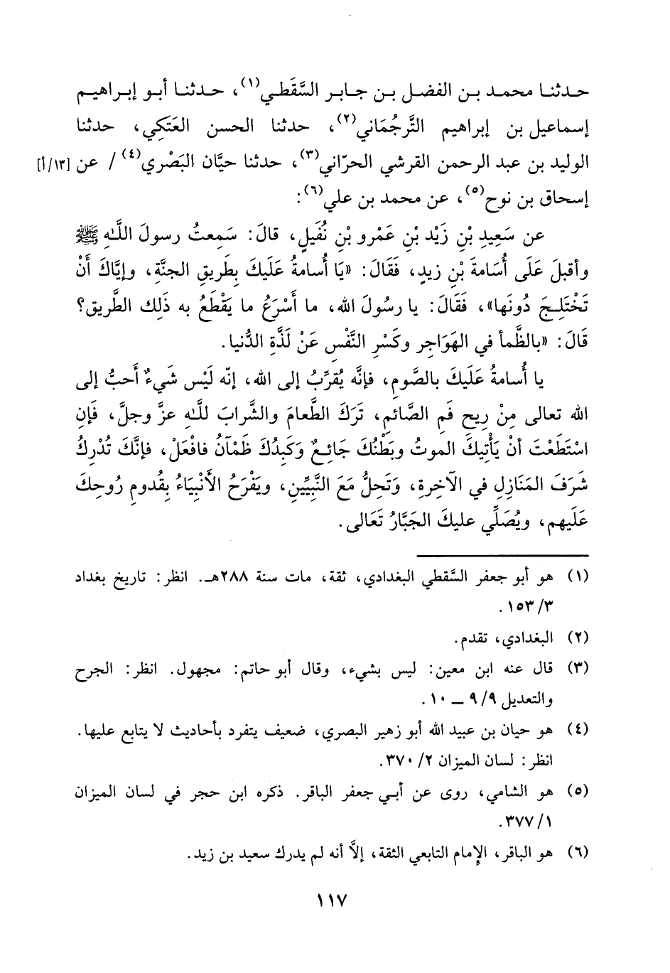 حَدَّثَنَا مُحَمَّدُ بْنُ الْفَضْلِ بْنِ جَابِرٍ السَّقَطِيُّ، حَدَّثَنَا أَبُو إِبْرَاهِيمَ إِسْمَاعِيلُ بْنُ إِبْرَاهِيمَ التَّرْجُمَانِيُّ، حَدَّثَنَا الْحَسَنُ الْعَتَكِيُّ، حَدَّثَنَا الْوَلِيدُ بْنُ عَبْدِ الرَّحْمَنِ الْقُرَشِيُّ الْحَرَّانِيُّ، حَدَّثَنَا حَيَّانُ الْبَصْرِيُّ، عَنْ إِسْحَاقَ بْنِ نُوحٍ، عَنْ مُحَمَّدِ بْنِ عَلِيٍّ، عَنِ سَعيِدِ بْنِ زَيْدِ بْنِ عَمْرِو بْنِ نُفَيلٍ، قَالَ: سَمِعْتُ رَسُولَ اللَّهِ صَلَّى اللَّهُ عَلَيْهِ وَسَلَّمَ، وَأَقْبَلَ عَلَى أُسَامَةَ بْنِ زَيْدٍ، فَقَالَ: " يَا أُسَامَةُ، عَلَيكَ بِطَرِيقِ الْجَنَّةِ وَإِيَّاكَ أَنْ تَخْتَلِجَ دُونَهَا " فَقَالَ: يَا رَسُولَ اللَّهِ، مَا أَسْرَعُ مَا يُقْطَعُ بِهِ ذَلِكَ الطَّرِيقَ؟ قَالَ صَلَّى اللَّهُ عَلَيْهِ وَسَلَّمَ: " بِالظَّمَإِ فِي الْهَوَاجِرِ وَكَسْرِ النَّفْسِ عَنْ لَذَّةِ الدَّنْيَا، يَا أُسَامَةُ عَلَيْكَ بِالصَّوْمِ، فَإِنَّهُ يُقَرِّبُ إِلَى اللَّهِ، إِنَّهُ لَيْسُ شَيْءٌ أَحَبُّ إِلَى اللَّهِ تَعَالَى مِنْ رِيحِ فَمِ الصَّائِمِ، اتَرُكِ الطَّعَامَ وَالشَّرَابَ لِلَّهِ عَزَّ وَجَلَّ، فَإِنِ اسْتَطَعْتَ أَنْ يَأْتِيكَ الْمَوْتُ وَبَطْنُكَ جَائِعٌ وَكَبِدُكَ ظَمْآنُ فَافْعَلْ، فَإِنَّكَ تُدْرِكُ شَرَفَ الْمَنَازِلِ فِي الْآخِرَةِ، وِتَحِلُّ مَعَ النَّبِيِّينَ، وَيَفْرَحُ الْأَنْبِيَاءُ بِقُدُومِ رَوْحِكَ عَلَيْهِمْ، وَيُصَلِّي عَلَيْكَ الْجَبَّارُ تَعَالَى،