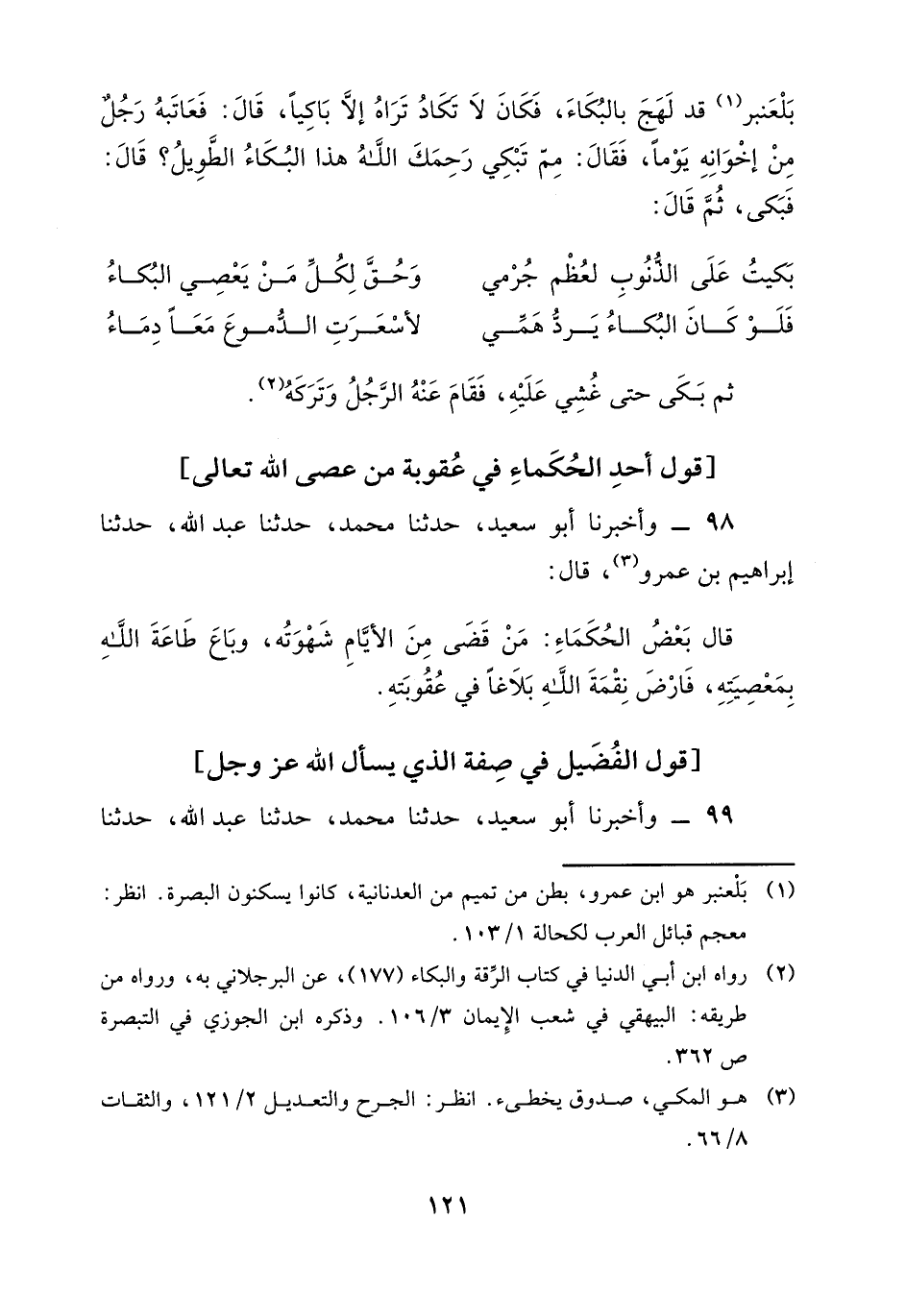 بَلْعَنْبَرِ قَدْ لَهَجَ بِالْبُكَاءَ، فَكَانَ لَا تَكَادُ تَرَاهُ إِلَّا بَاكِيًا، قَالَ: فَعَاتَبَهُ رَجُلٌ مِنْ إِخْوَانِهِ يَوْمًا، فَقَالَ: مِمَّ تَبْكِي رَحِمَكَ اللَّهُ هَذَا الْبُكَاءُ الطَّويِلُ؟ قَالَ: فَبَكَى، ثُمَّ قَالَ: