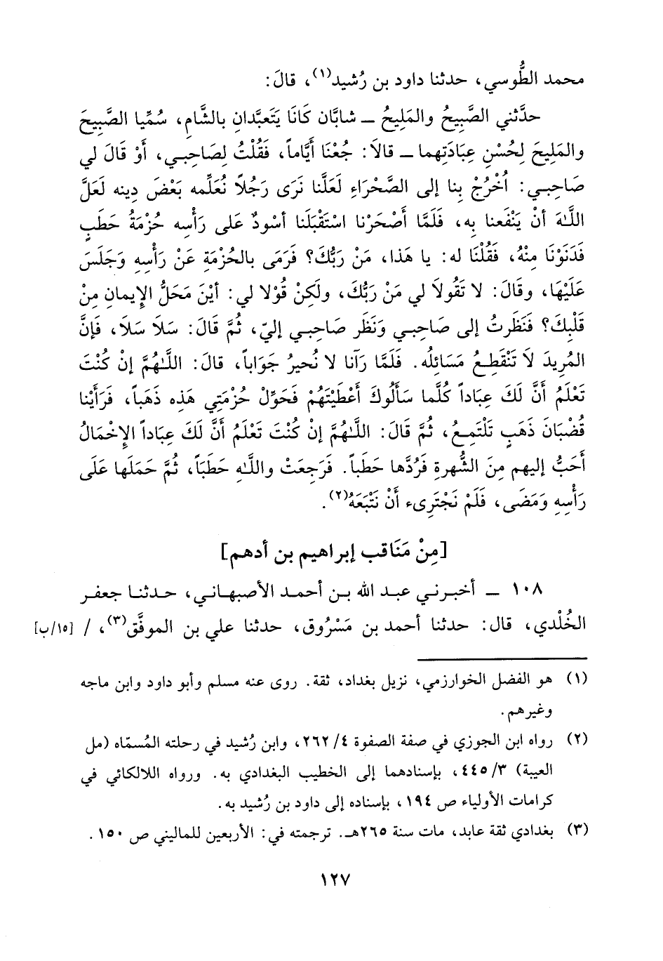 مُحَمَّدٍ الطُّوسِيُّ، حَدَّثَنَا دَاوُدُ بْنُ رُشَيْدٍ، قَالَ: حَدَّثَنِي الصَّبِيحُ، وَالْمَلِيحُ، شابان كانا يتعبدان بالشام سميا الصبيح والمليح لحسن عبادتهما، قَالَا: جُعْنَا أَيَّامًا، فَقُلْتُ لِصَاحِبِي، أَوْ قَالَ لِي صَاحِبِي: " أُخْرُجْ بِنَا إِلَى الصَّحْرَاءِ لَعَلَّنَا نَرَى رَجُلًا نُعَلِّمَهُ بَعْضَ دِينَهُ، لَعَلَّ اللَّهَ أَنْ يَنْفَعَنَا بِهِ، فَلَمَّا أَصْحَرْنَا اسْتَقْبَلَنَا أَسْودٌ عَلَى رَأْسِهِ حُزْمَةُ حَطَبٍ فَدَنَوْنَا مِنْهُ، فَقُلْنَا لَهُ: يَا هَذَا، مَنْ رَبُّكَ؟ فَرَمَى بِالْحُزْمَةِ عَنْ رَأْسِهِ وَجَلَسَ عَلَيْهَا، وَقَالَ: لَا تَقُولَا لِي مَنْ رَبُّكَ، وَلَكِنْ قُولا لِي: أَيْنَ مَحَلُّ الْإِيمَانِ مِنْ قَلْبِكَ؟ فَنَظَرْتُ إِلَى صَاحِبِي وَنَظَرَ صَاحِبِي إِلَيَّ، ثُمَّ قَالَ: سَلَا سَلَا، فَإِنَّ الْمُرِيدَ لَا تَنْقَطِعُ مَسَائِلُهُ فَلَمَّا رَآنَا لَا نُحِيرُ جَوَابًا، قَالَ: اللَّهُمَّ إِنْ كُنْتَ تَعْلَمُ أَنَّ لَكَ عِبَادًا كُلَّما سَأَلُوكَ أَعْطَيْتَهُمْ، فَحَوِّلْ حُزْمَتِي هَذِهِ ذَهَبًا، فَرَأَيْنَا قُضْبَانَ ذَهَبٍ تَلْتَمِعُ، ثُمَّ قَالَ: اللَّهُمَّ إِنْ كُنْتَ تَعْلَمُ أَنَّ لَكَ عِبَادًا الْإِخْمَالُ أَحَبُّ إِلَيْهِمْ مِنَ الشُّهْرَةِ فَرَدَّهَا حَطَبًا، فَرَجِعَتْ وَاللَّهِ حَطَبًا، ثُمَّ حَمَلَها عَلَى رَأْسِهِ وَمَضَى، فَلَمْ نَجْتَرِئْ أَنْ نَتْبَعَهُ "
