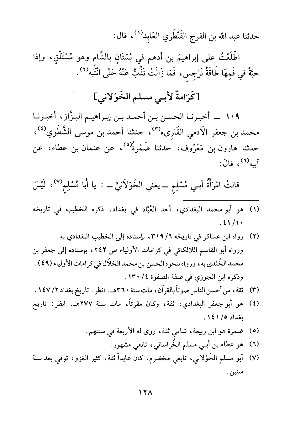 109 - أَخْبَرَنَا الْحَسَنُ بْنُ أَحْمَدَ بْنِ إِبْرَاهِيمَ الْبَزَّازُ، أَخْبَرَنَا مُحَمَّدُ بْنُ جَعْفَرٍ الْآدَمِيُّ الْقَارِئُ، حَدَّثَنَا أَحْمَدُ بْنُ مُوسَى الشَّطَوِيُّ، حَدَّثَنَا هَارُونُ بْنُ مَعْرُوفٍ، حَدَّثَنَا ضَمْرَةُ، عَنْ عُثْمَانَ بْنِ عَطَاءٍ، عَنْ أَبِيهِ، قَالَ: قَالَتِ امْرَأَةُ أَبِي مُسْلِمٍ يَعْنِي الْخَوْلَانِيَّ: يَا أَبَا مُسْلِمٍ، لَيْسَ