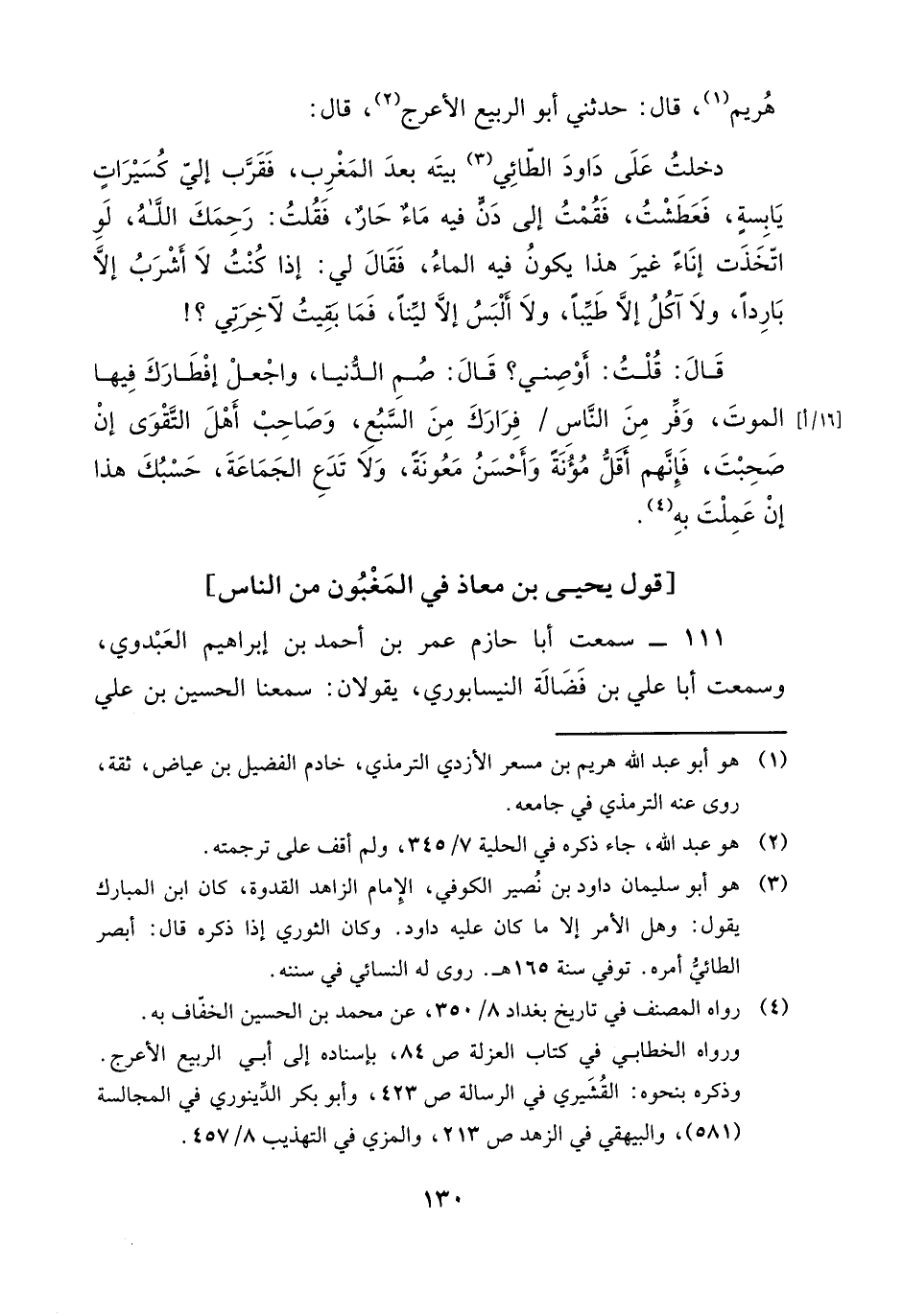 هُرَيْمٌ، قَالَ: حَدَّثَنِي أَبُو الرَّبِيعِ الْأَعْرَجُ، قَالَ: دَخَلْتُ عَلَى دَاودَ الطَّائِيِّ بَيْتَهُ بَعْدَ الْمَغْرِبِ، فَقَرَّبَ إِلَيَّ كُسَيْرَاتٍ يَابِسَةٍ فَعَطِشْتُ، فَقُمْتُ إِلَى دَنٍّ فِيهِ مَاءٌ حَارٌ، فَقُلتُ: رَحِمَكَ اللَّهُ، لَوِ اتَّخَذَتَ إِنَاءً غَيْرَ هَذَا يَكُونُ فِيهِ الْمَاءُ، فَقَالَ لِي: إِذَا كُنْتُ لَا أَشْرَبُ إِلَّا بَارِدًا وَلَا آكُلُ إِلَّا طَيِّبًا، وَلَا أَلْبَسُ إِلَّا لَيِّنًا، فَمَا بَقِيتُ لِآخِرَتِي "؟ قَالَ: قُلْتُ: أَوْصِنِي؟ قَالَ: " صُمِ الدُّنْيَا، وَاجْعَلْ إِفْطَارَكَ فِيهَا الْمَوْتَ، وَفِّرَّ مِنَ النَّاسِ فِرَارَكَ مِنَ السَّبُعِ، وَصَاحِبْ أَهْلَ التَّقْوَى إِنْ صَحِبْتُ فَإِنَّهَمْ أَقَلُّ مَؤُنَةً وَأَحْسَنُ مَعُونَةً، ولَا تَدَعِ الْجَمَاعَةَ، حَسْبُكَ هَذَا إِنْ عَمِلْتَ بِهِ "