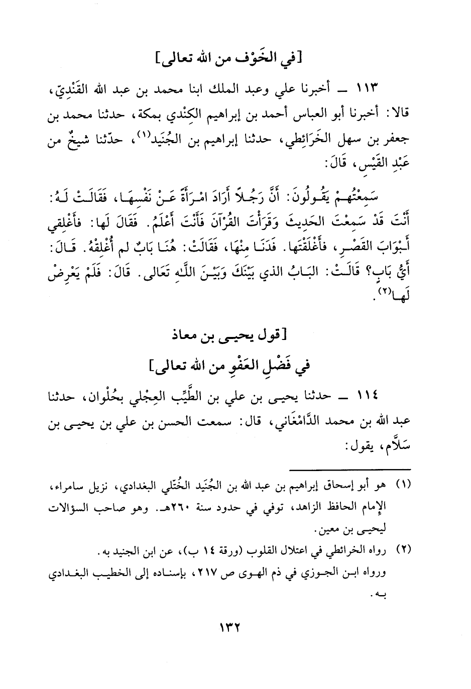 113 - أَخْبَرَنَا عَلِيٌّ، وَعْبَدُ الْمَلِكِ ابنا محمد بن عبد الله القندي، قَالَا: أَخْبَرَنَا أَبُو الْعَبَّاسِ أَحْمَدُ بْنُ إِبْرَاهِيمَ الْكِنْدِيُّ بِمَكَّةَ، حَدَّثَنَا مُحَمَّدُ بْنُ جَعْفَرِ بْنِ سَهْلٍ الْخَرَائِطِيُّ، حَدَّثَنَا إِبْرَاهِيمُ بْنُ الْجُنَيْدِ، حَدَّثَنَا شَيْخٌ مِنْ عَبْدِ الْقَيْسِ، قَالَ: سَمِعْتُهُمْ يَقُولُونَ: " أَنَّ رَجُلًا أَرَادَ امْرَأَةً عَنْ نَفْسِهَا، فَقَالَتْ لَهُ: أَنْتَ قَدْ سَمِعْتَ الْحَدِيثَ وِقَرَأْتَ القُرْآنَ فَأَنْتَ أَعْلَمُ فَقَالَ لَهَا: فَأَغْلِقِي أَبْوَابَ الْقَصْرِ، فَأَغْلَقَتْهَا فَدَنَا مِنْهَا، فَقَالَتْ: هُنَا بَابٌ لَمْ أُغْلِقْهُ قَالَ: أَيُّ بَابٍ؟ قَالَتْ: الْبَابُ الَّذِي بَيْنَكَ وَبَيْنَ اللَّهِ تَعَالَى قَالَ: فَلَمْ يَعْرِضْ لَهَا "