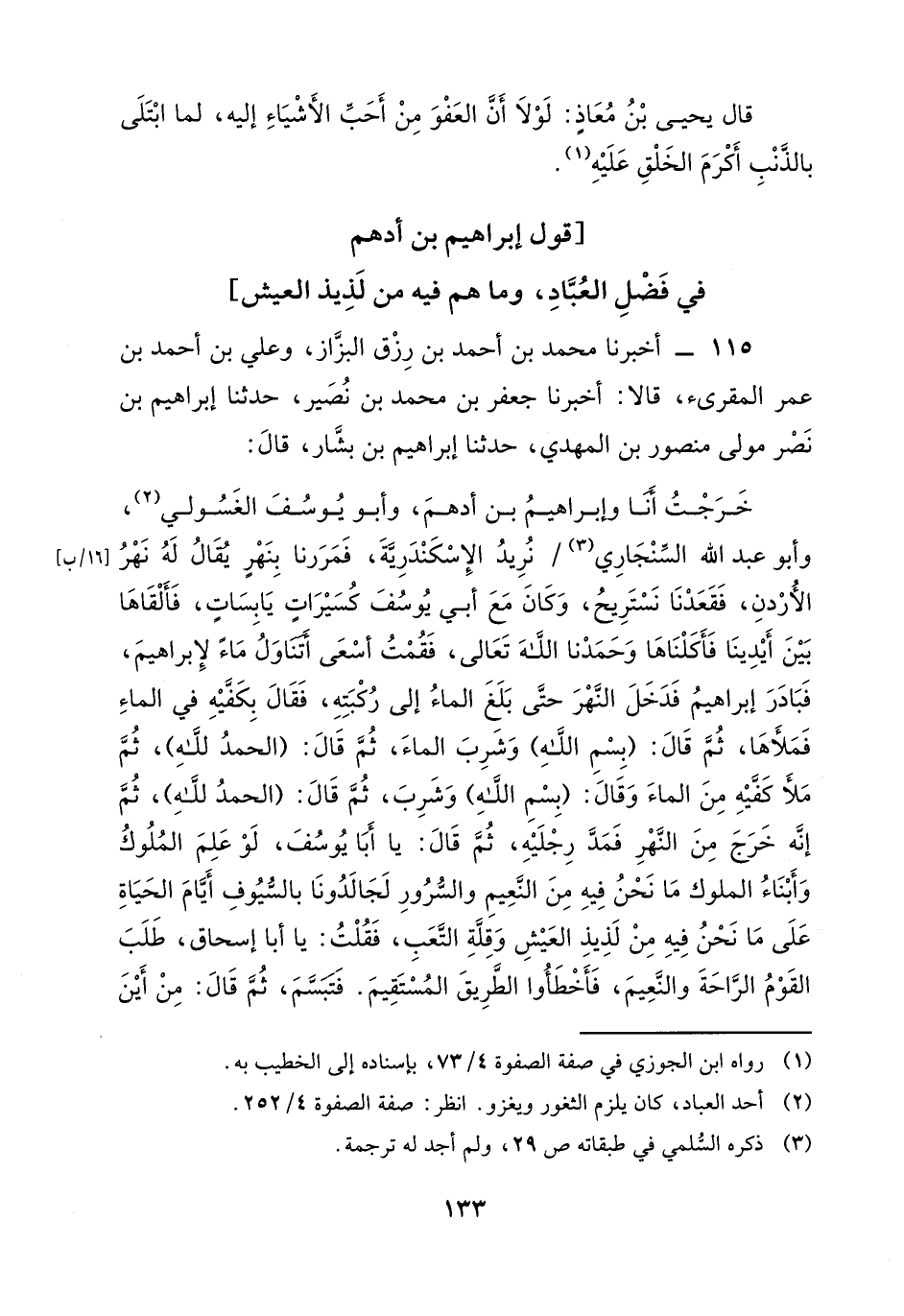115 - أَخْبَرَنَا مُحَمَّدُ بْنُ أَحْمَدَ بْنِ رِزْقٍ الْبَزَّازُ، وَعَلِيُّ بْنُ أَحْمَدَ بْنِ عُمَرَ الْمُقْرِئُ، قَالَا: أَخْبَرَنَا جَعْفَرُ بْنُ مُحَمَّدِ بْنِ نُصَيْرٍ، حَدَّثَنَا إِبْرَاهِيمُ بْنُ نَصْرٍ مَوْلَى مَنْصُورِ بْنِ الْمَهْدِيِّ، حَدَّثَنَا إِبْرَاهِيمُ بْنُ بَشَّارٍ، قَالَ: خَرَجْتُ أَنَا وَإِبْرَاهِيمُ بْنُ أَدْهَمَ، وَأَبُو يُوسُفَ الْغَسُولِيُّ، وَأَبُو عَبْدِ اللَّهِ السِّنْجَارِيُّ نُرِيدُ، فَمَرَرْنَا بِنَهْرٍ يُقَالُ لَهُ: نَهْرُ الْأُرْدُنِ، فَقَعَدْنَا نَسْتَرِيحُ، وَكَانَ مَعَ أَبِي يُوسُفَ كُسَيْرَاتٍ يَابِسَاتٍ، فَأَلْقَاهَا بَيْنَ أَيْدِينَا فَأَكَلْنَاهَا وَحَمَدْنَا اللَّهَ تَعَالَى، فَقُمْتُ أَسْعَى أَتَنَاوَلُ مَاءً لِإِبْرَاهِيمَ، فَبَادَرَ إِبْرَاهِيمُ فَدَخَلَ النَّهْرَ حَتَّى بَلَغَ الْمَاءُ إِلَى رُكْبَتِهِ، فَقَالَ بِكَفَّيْهِ فِي الْمَاءِ فَمَلَأَهَا، ثُمَّ قَالَ: بِسْمِ اللَّهِ، وَشَرِبَ الماءَ، ثُمَّ قَالَ: الْحَمْدُ لِلَّهِ، ثُمَّ مَلَأَ كَفَّيْهِ مِنَ الْمَاءِ، وَقَالَ: وَشَرِبَ، ثم بِسْمِ اللَّهِ قَالَ: الْحَمْدُ لِلَّهِ، ثُمَّ إِنَّهُ خَرَجَ مِنَ النَّهْرِ فَمَدَّ رِجْلَيْهِ، ثُمَّ قَالَ: " يَا أَبَا يُوسُفَ، لَوْ عَلِمَ الْمُلُوكُ وَأَبْنَاءُ الْمُلُوكِ مَا نَحْنُ فِيهِ مِنَ النَّعِيمِ وَالسُّرُورِ لَجَالَدُونَا بِالسُّيُوفِ أَيَّامَ الْحَيَاةِ عَلَى مَا نَحْنُ فِيهِ مِنْ لَذِيذِ الْعَيْشِ وَقِلَّةِ التَّعَبِ، فَقُلْتُ: يَا أَبَا إِسْحَاقَ، طَلَبَ القَوْمُ الرَّاحَةَ وَالنَّعِيمَ، فَأَخْطَئُوا الطَّرِيقَ الْمُسْتَقِيمَ، فَتَبَسَّمَ، ثُمَّ قَالَ: " مِنْ أَينْ