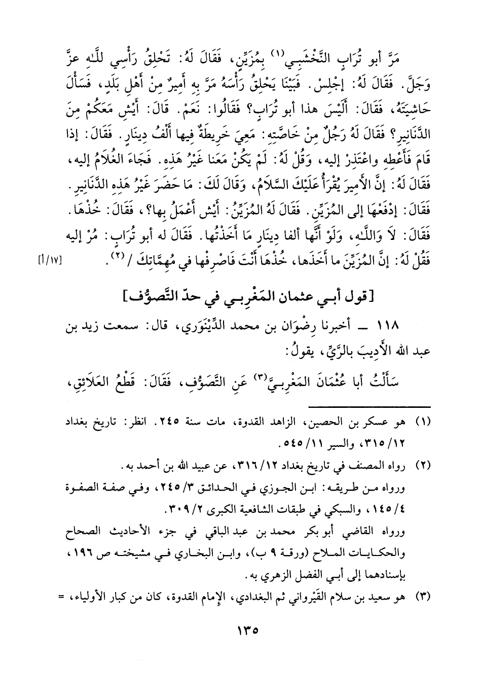 118 - أَخْبَرَنَا رِضْوَانُ بْنُ مُحَمَّدٍ الدَّيْنَوَرِيُّ، قَالَ: سَمِعْتُ زَيْدَ بْنَ عَبْدِ اللَّهِ الْأَدِيبَ، بِالرَّيِّ يَقُولُ: سَأَلْتُ أَبَا عُثْمَانَ الْمَغْرِبيَّ عَنِ التَّصَوُّفِ، فَقَالَ: " قَطْعُ الْعَلَائِقِ،